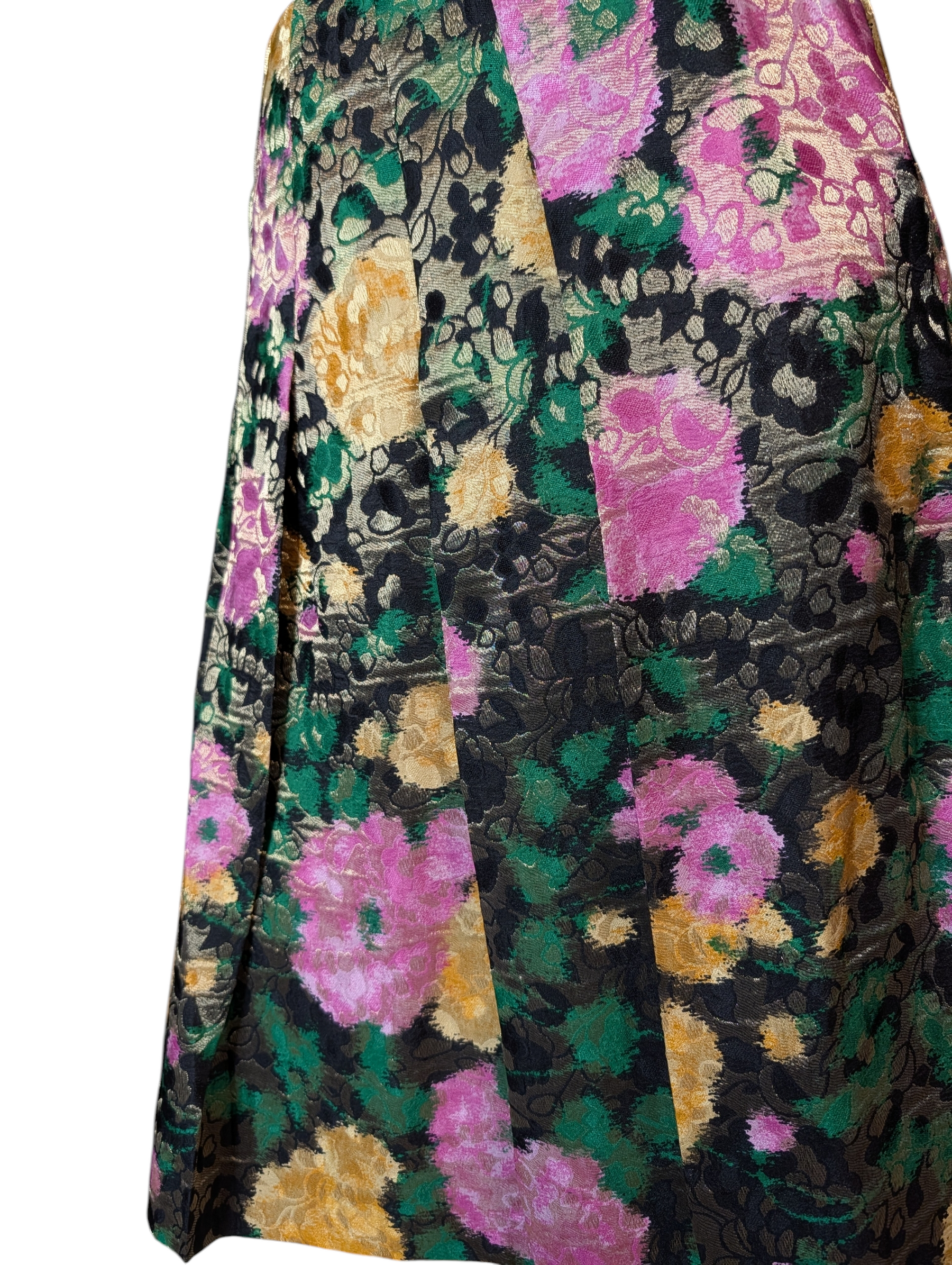 This rare Miu Miu Spring/Summer 2004 jacquard silk skirt is a true collector’s piece, famously featured in the Mario Testino–shot campaign for the season. Crafted in Italy, it showcases a richly textured floral jacquard in saturated tones of pink, gold, green, and black, creating a dimensional painterly effect that’s instantly recognizable from the runway era.