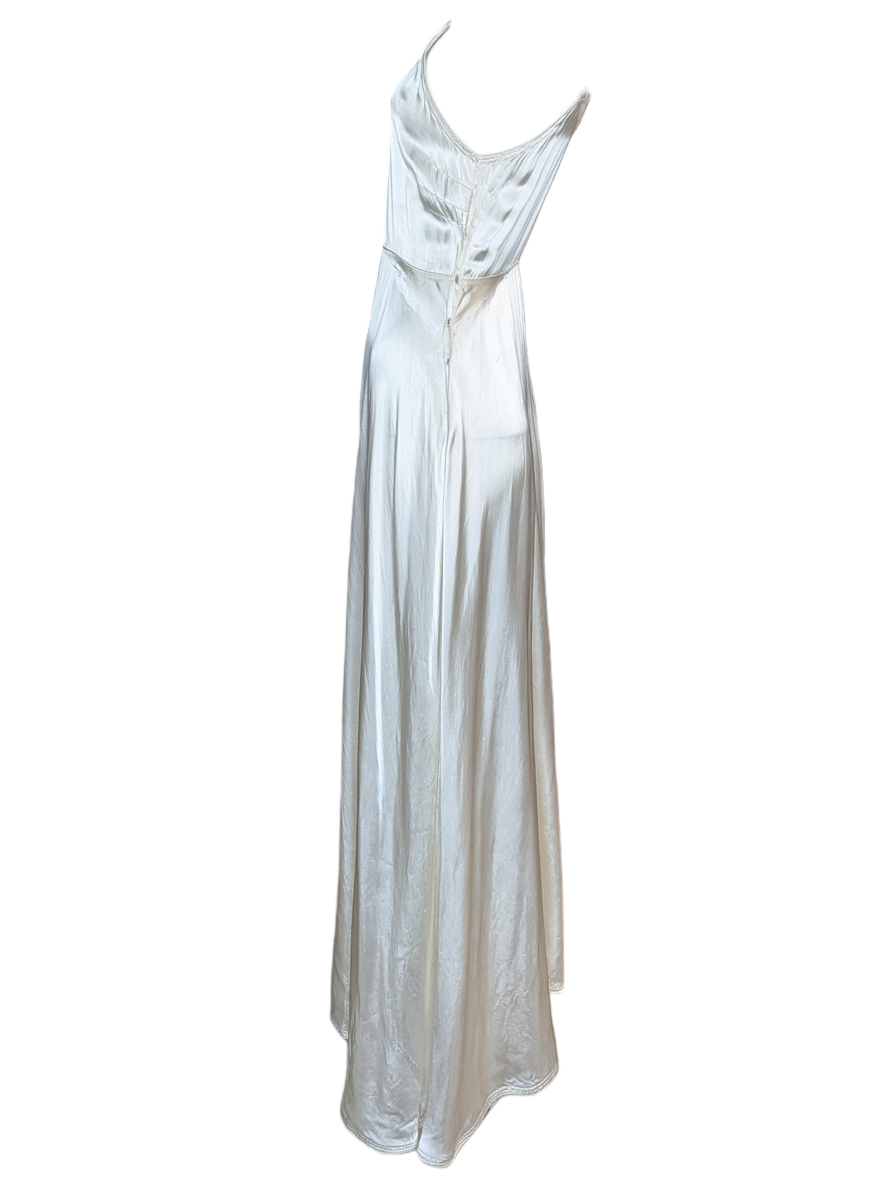This elegant 1930s bias-cut silk slip dress exemplifies the quiet sophistication and technical mastery of early modern evening wear. Cut on the bias to skim the body with fluid movement, the gown reflects the period’s shift toward natural silhouettes and understated luxury,.