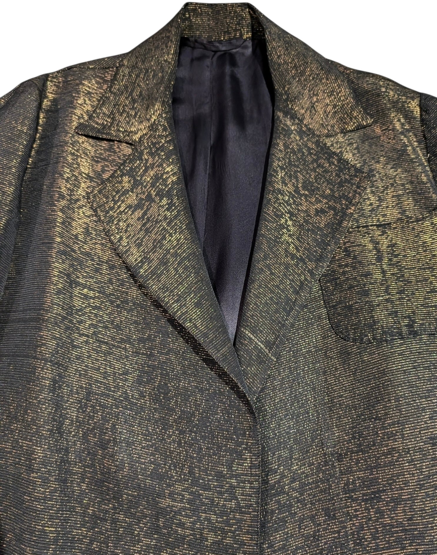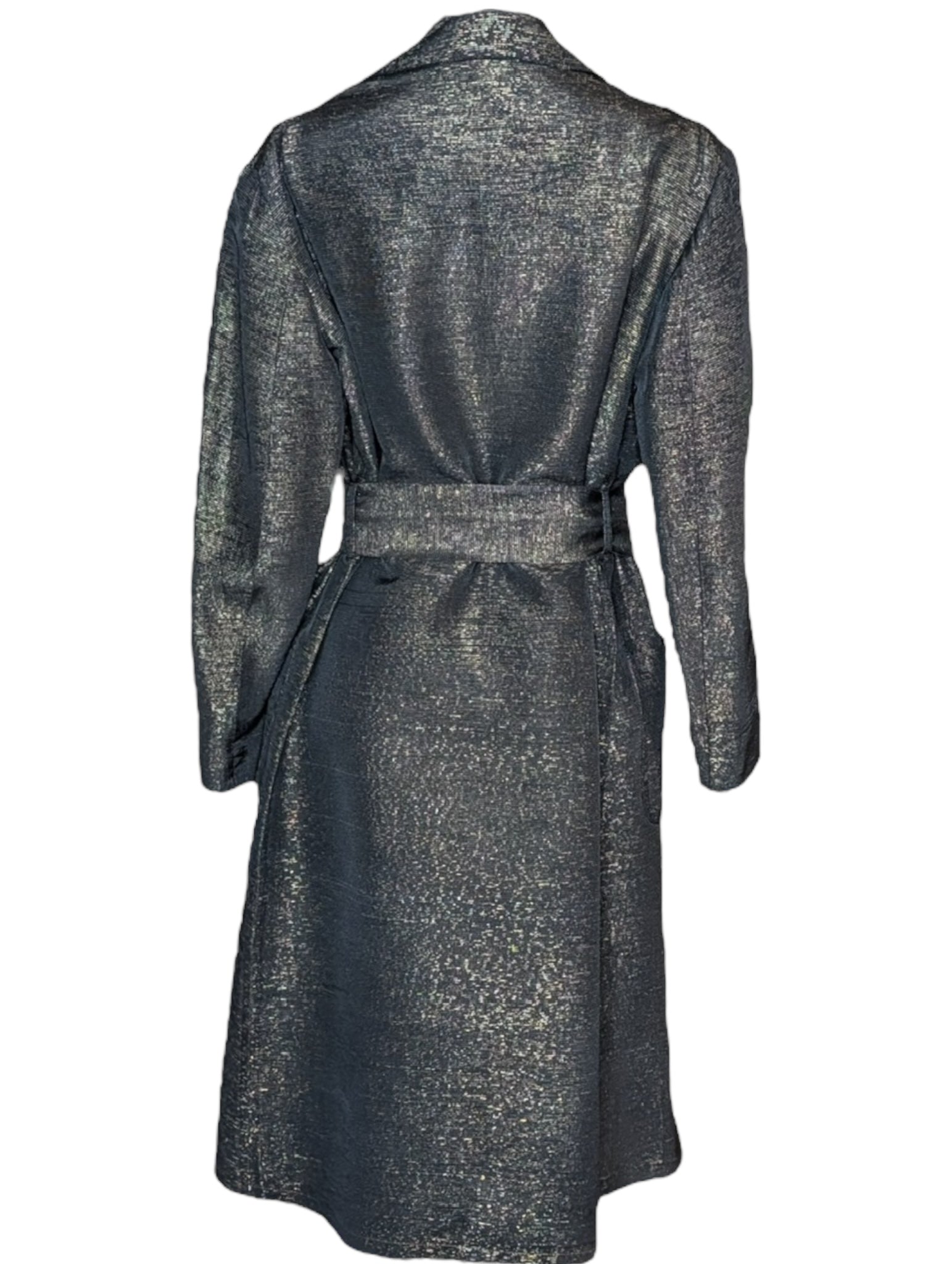 A striking and modern-feeling piece from the 1940s, this black and gold wrap trench coat blends vintage sophistication with contemporary edge. Crafted from a subtly shimmering metallic-textured fabric, the coat catches light beautifully while maintaining the structured elegance of mid-century outerwear.