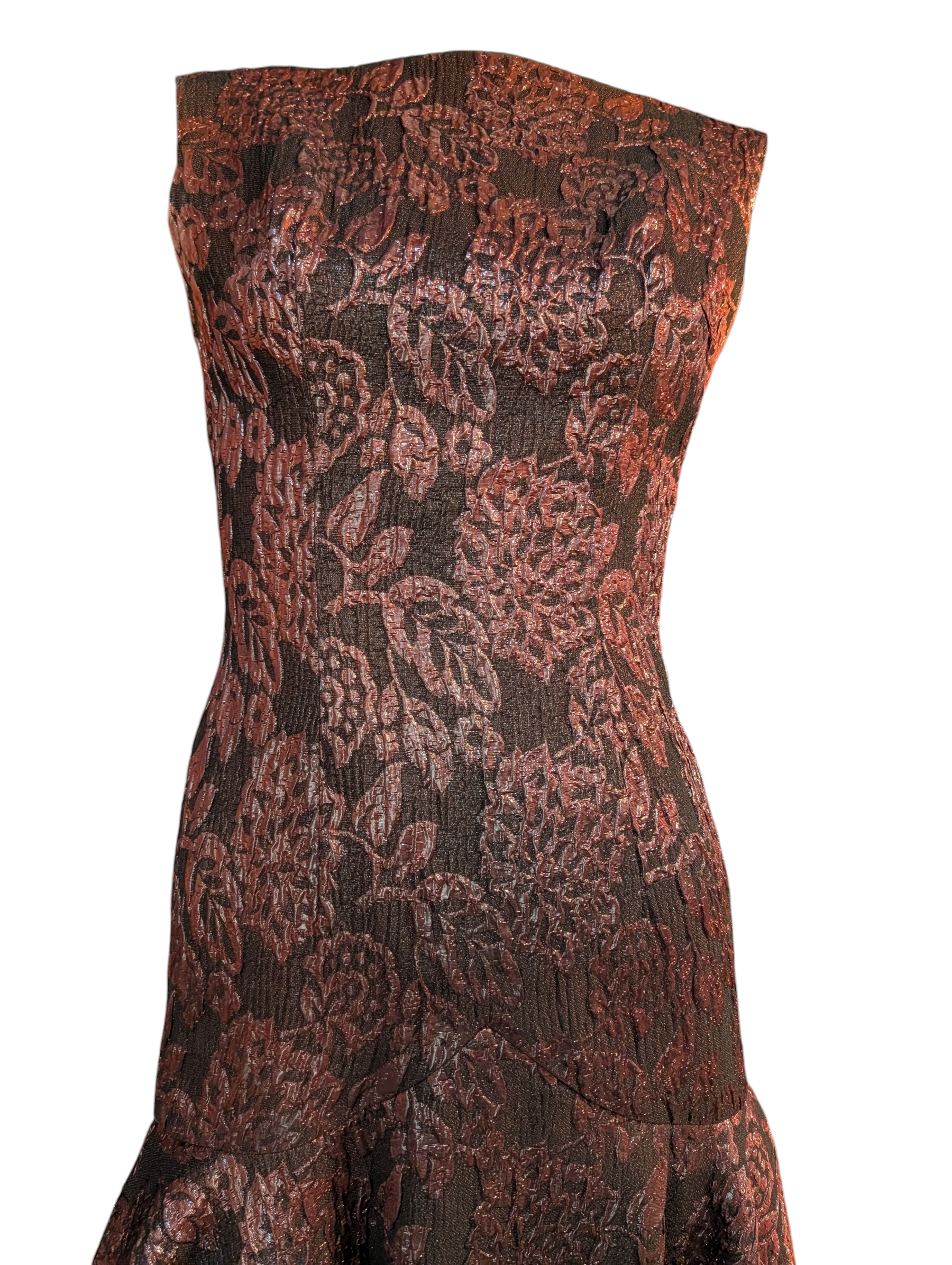 A richly detailed 1940s cocktail dress crafted from deep burgundy jacquard with an ornate floral motif. This mid-century silhouette features a structured bodice, sculpted waistline, and dramatic godet panels that create sweeping movement through the skirt. The piece closes with a period back zipper and displays the meticulous construction characteristic of 1940s eveningwear.