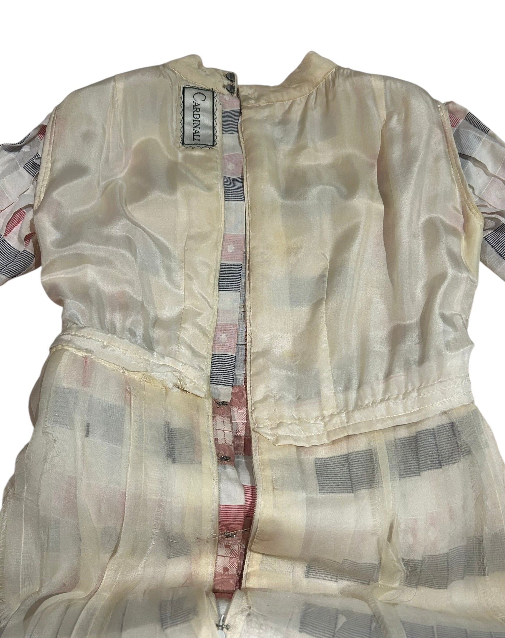 An extraordinary and one-of-a-kind WWII-era jumpsuit by Cardinali, this rare piece captures the ingenuity and elegance of 1940s design. Crafted from soft cotton in a geometric red, white, and blue check pattern, it’s accented with pink silk dupioni ribbon, blending structural precision with romantic detail.