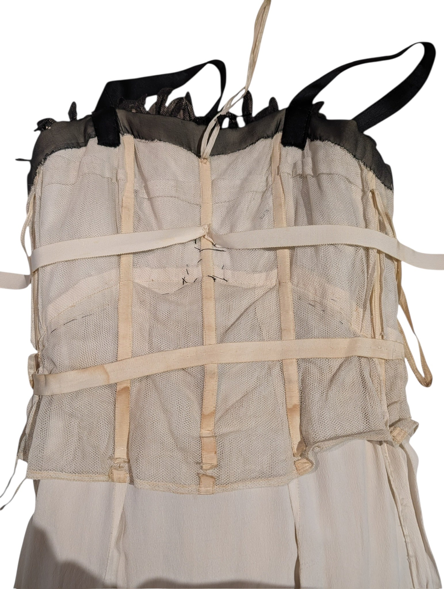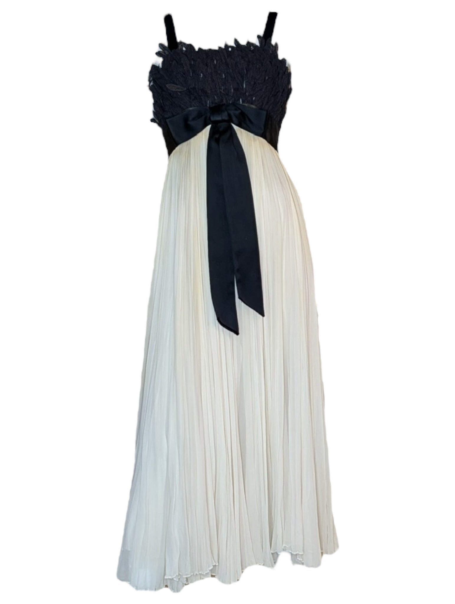 A breathtaking example of 1960s evening elegance, this Evelyn Byrnes gown pairs ethereal movement with sculptural detail. The bodice is adorned with black feather-like appliqué, creating rich texture and dimension, while silk ribbon straps and a dramatic front silk bow add a touch of romantic refinement.