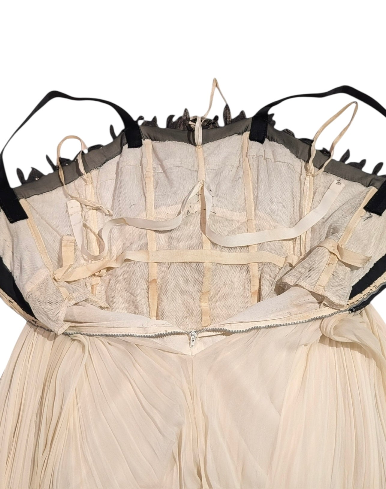 Below, the skirt cascades in soft, airy folds of cream silk chiffon, its pleated drape moving with cloudlike lightness. Fully lined in stretch rayon for comfort and fluidity, the gown maintains a beautiful silhouette while allowing ease of wear. A back zipper closure preserves the clean lines of the design.