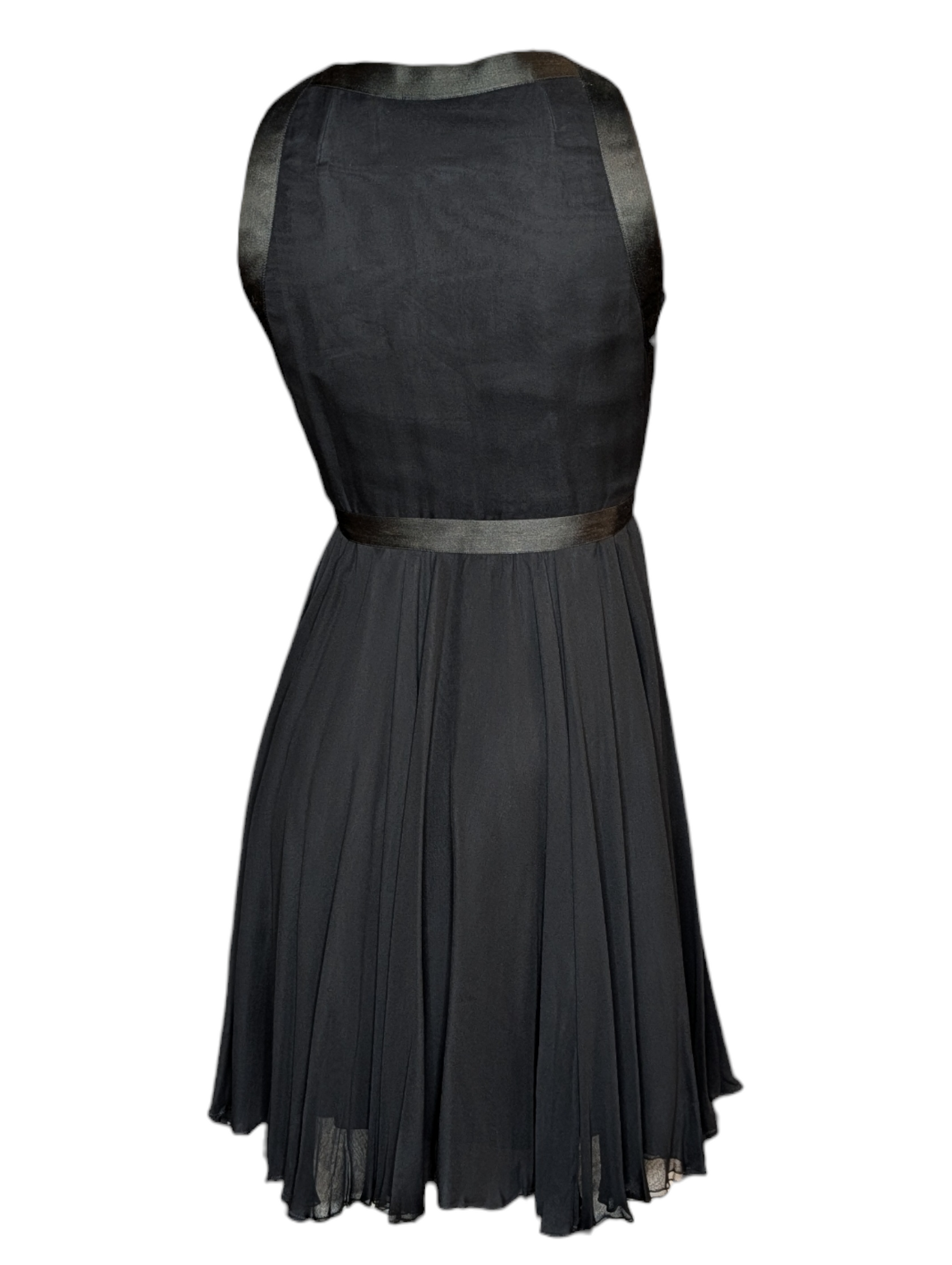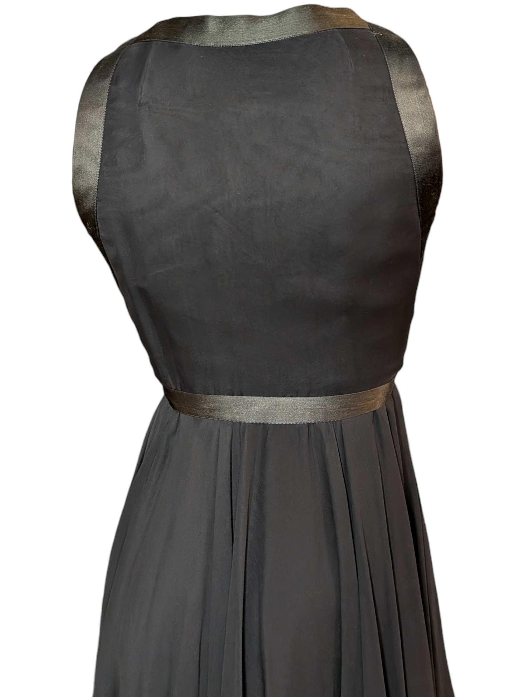 This exquisite 1960s Sarmi babydoll dress captures the designer’s signature romantic glamour. Crafted from airy black chiffon, the dress features a softly flared, floaty silhouette balanced by a plunging V-neckline framed in glossy black satin. A delicate satin ribbon tie cinches the empire waist, adding definition and elegance.