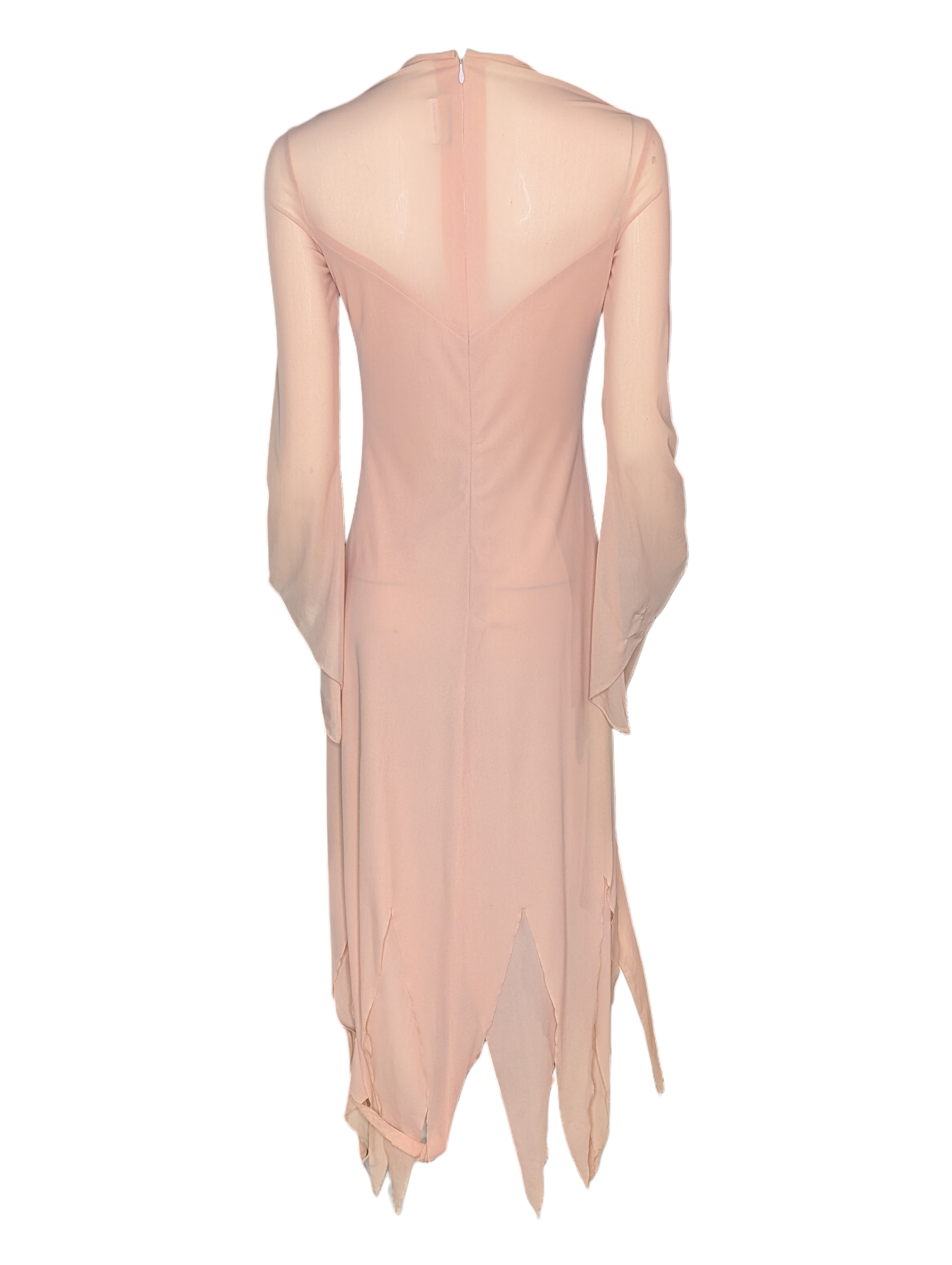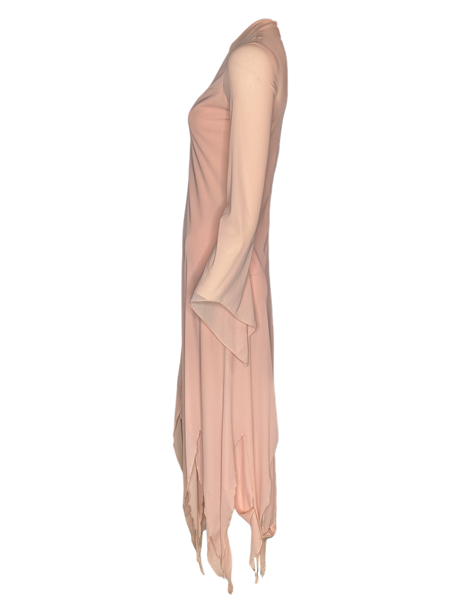 Long flowing sleeves extend into softly flared cuffs, enhancing the ethereal movement of the piece. The skirt falls gracefully from the waist before opening into an irregular pointed hemline that creates sculptural movement with each step. This organic hem treatment was a popular design element of the mid-1970s, emphasizing fluidity and romantic drama.