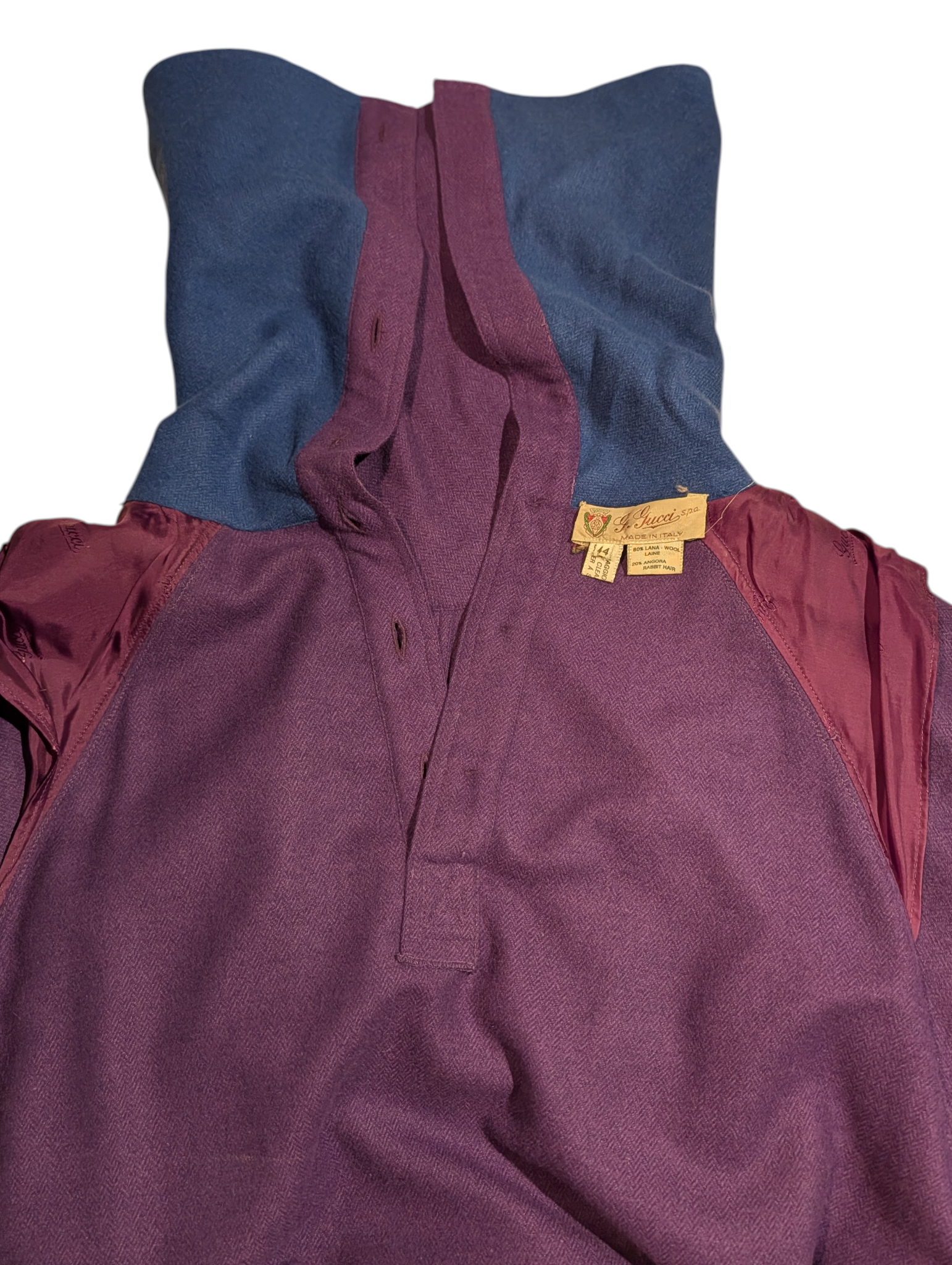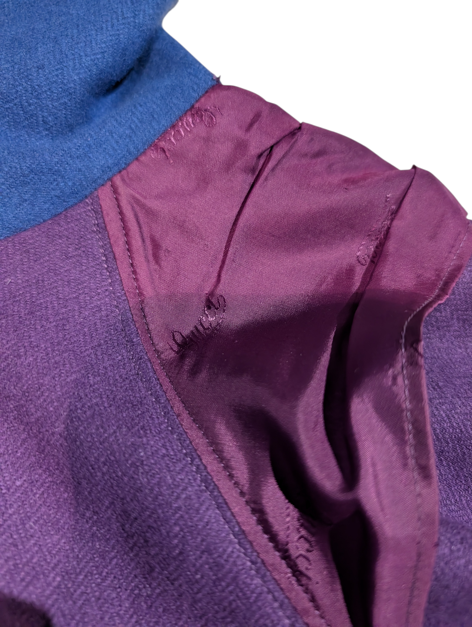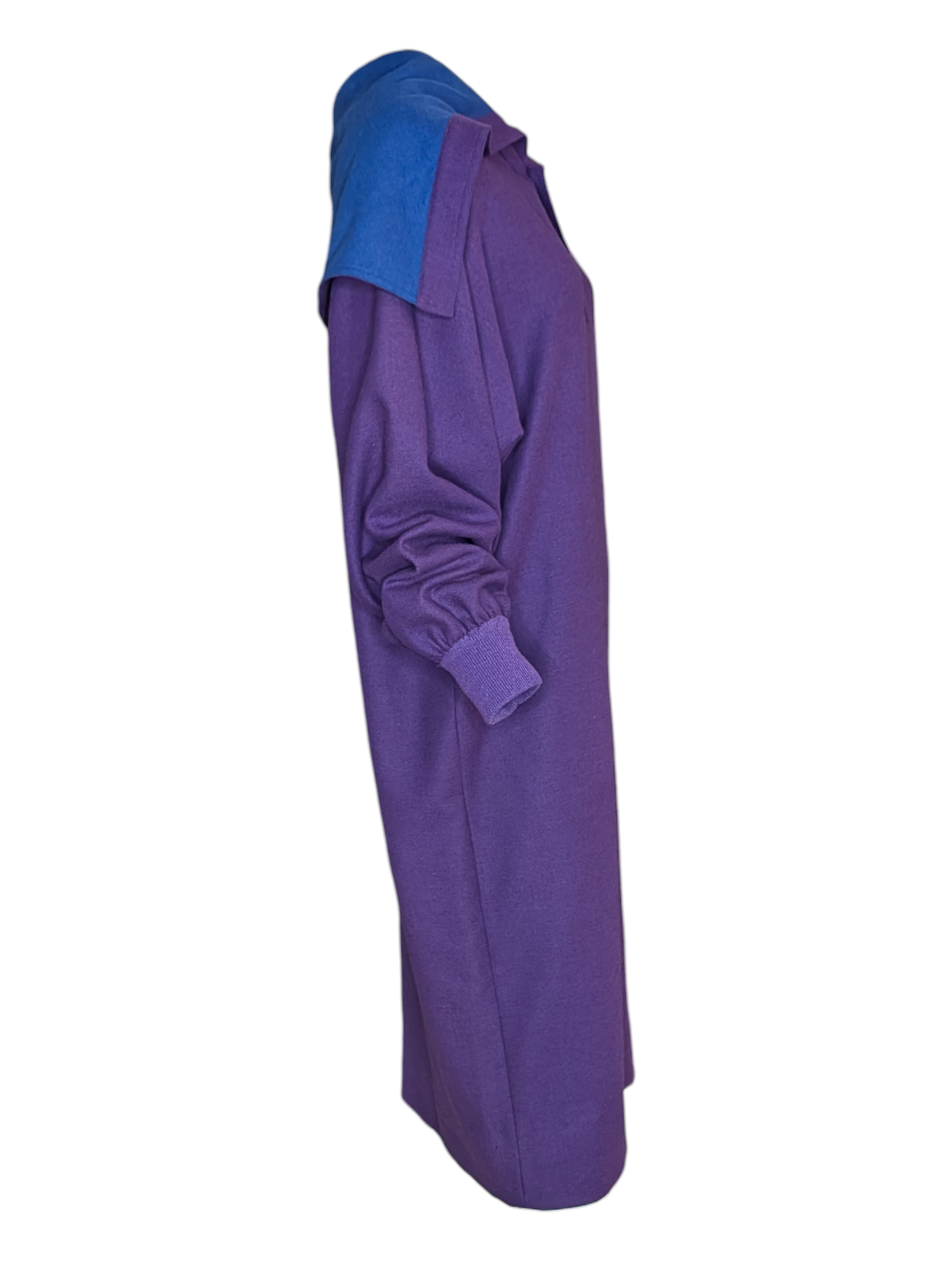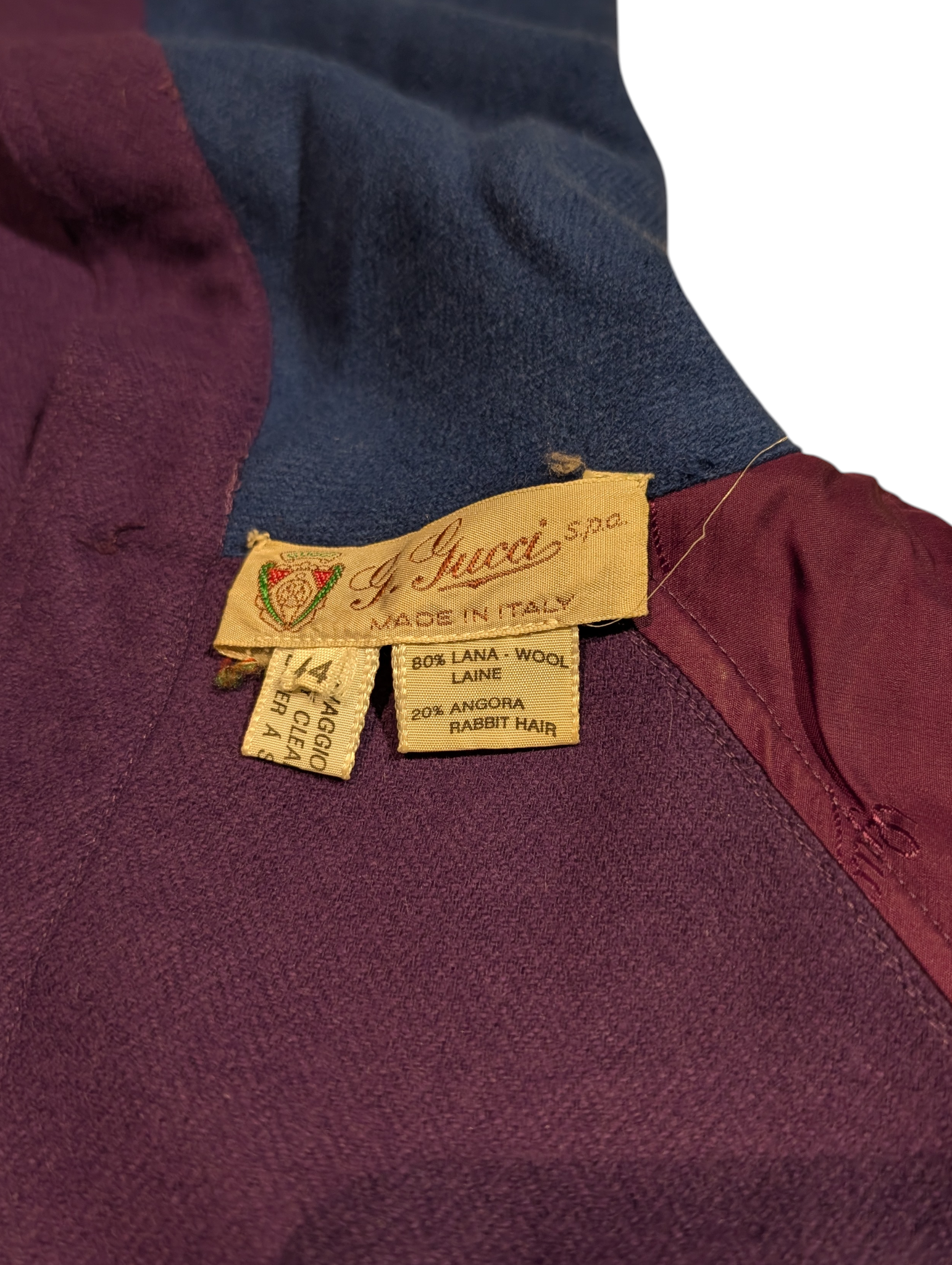 Early 1980s Gucci wool and angora knit dress executed in a saturated violet hue with contrasting cobalt cape collar. Crafted in Italy from an 80% lana wool and 20% angora rabbit hair blend, the silhouette falls in a relaxed column with raglan sleeves and ribbed cuffs.
