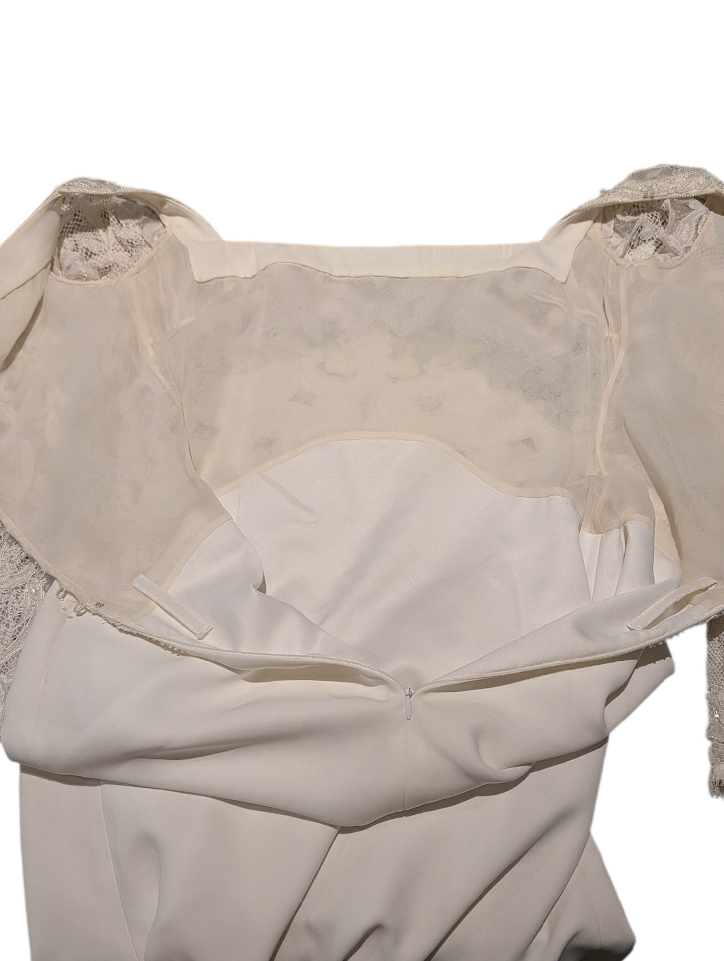 Exceptional vintage Badgley Mischka wedding gown dating to the 1990s, crafted as a designer sample piece. This elegant bridal dress features a fitted bodice with intricate hand-applied lace embroidery, beadwork, and sequin detailing, balanced by long sheer lace sleeves and a graceful square neckline. The gown flows into a smooth, lightly draped skirt with an extended train, creating a timeless bridal silhouette.