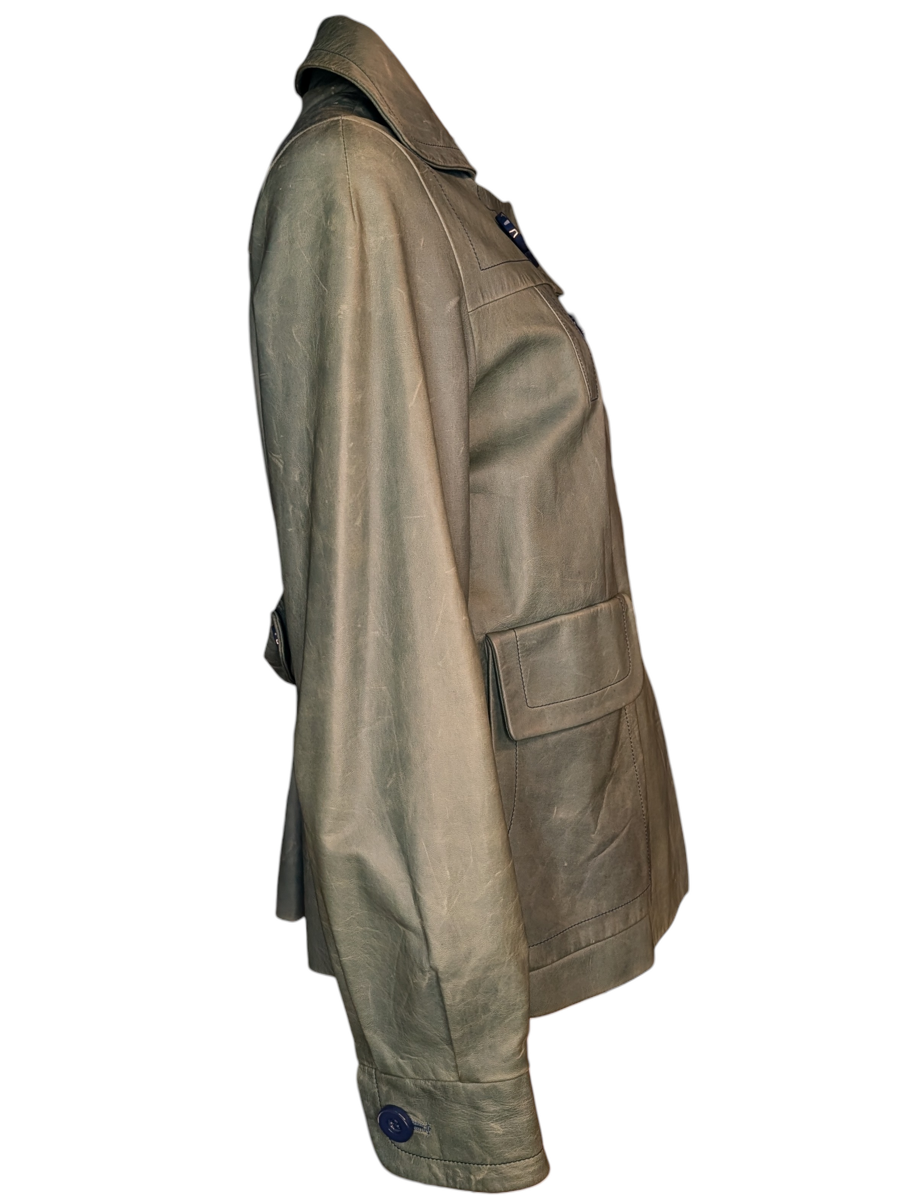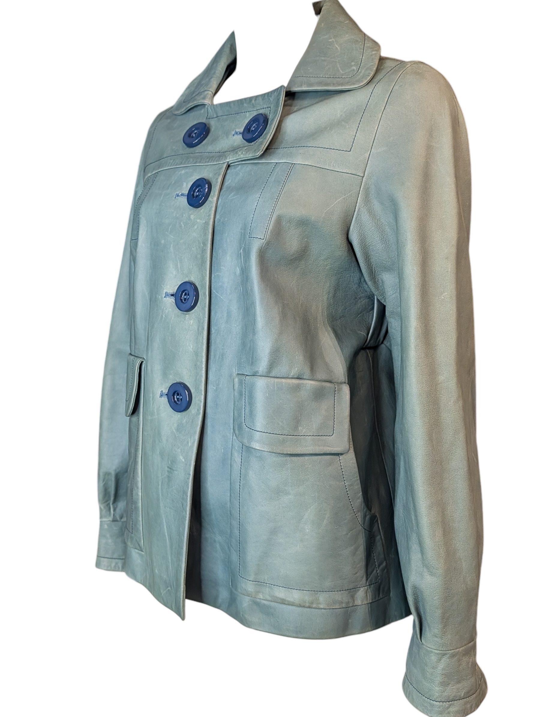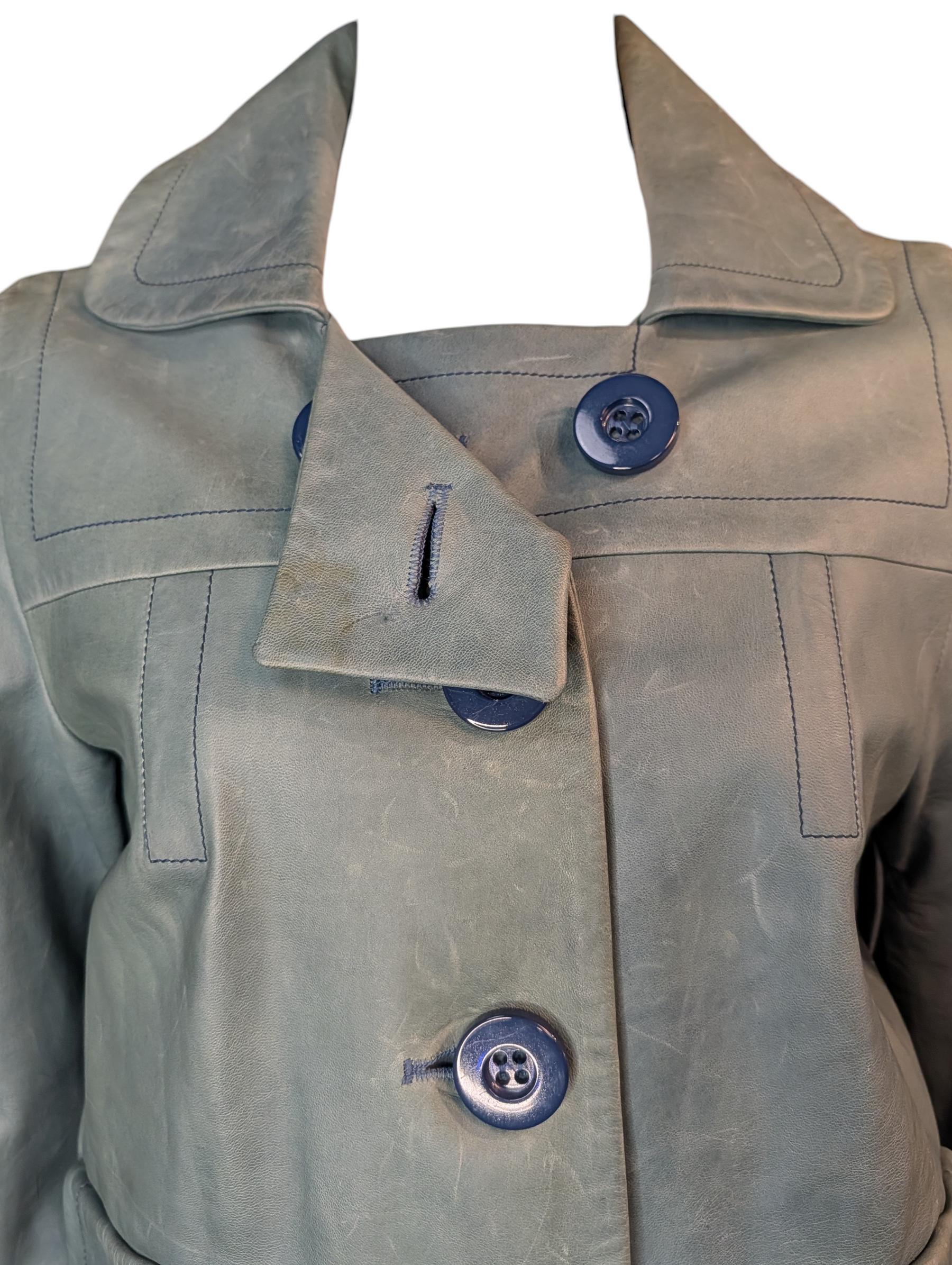 This authentic Chloé lambskin leather jacket is crafted in France from supple, garment-dyed lambskin in a muted blue-green tone. The silhouette is softly structured with a wide collar, oversized tonal blue buttons, and practical patch pockets at the front. A subtle back belt detail adds shape while maintaining the relaxed, utilitarian elegance Chloé is known for. Fully lined for comfort, this piece showcases natural leather patina consistent with age and wear, enhancing its character and vintage appeal. A refined yet effortless jacket ideal for transitional layering and collectors of French luxury fashion.