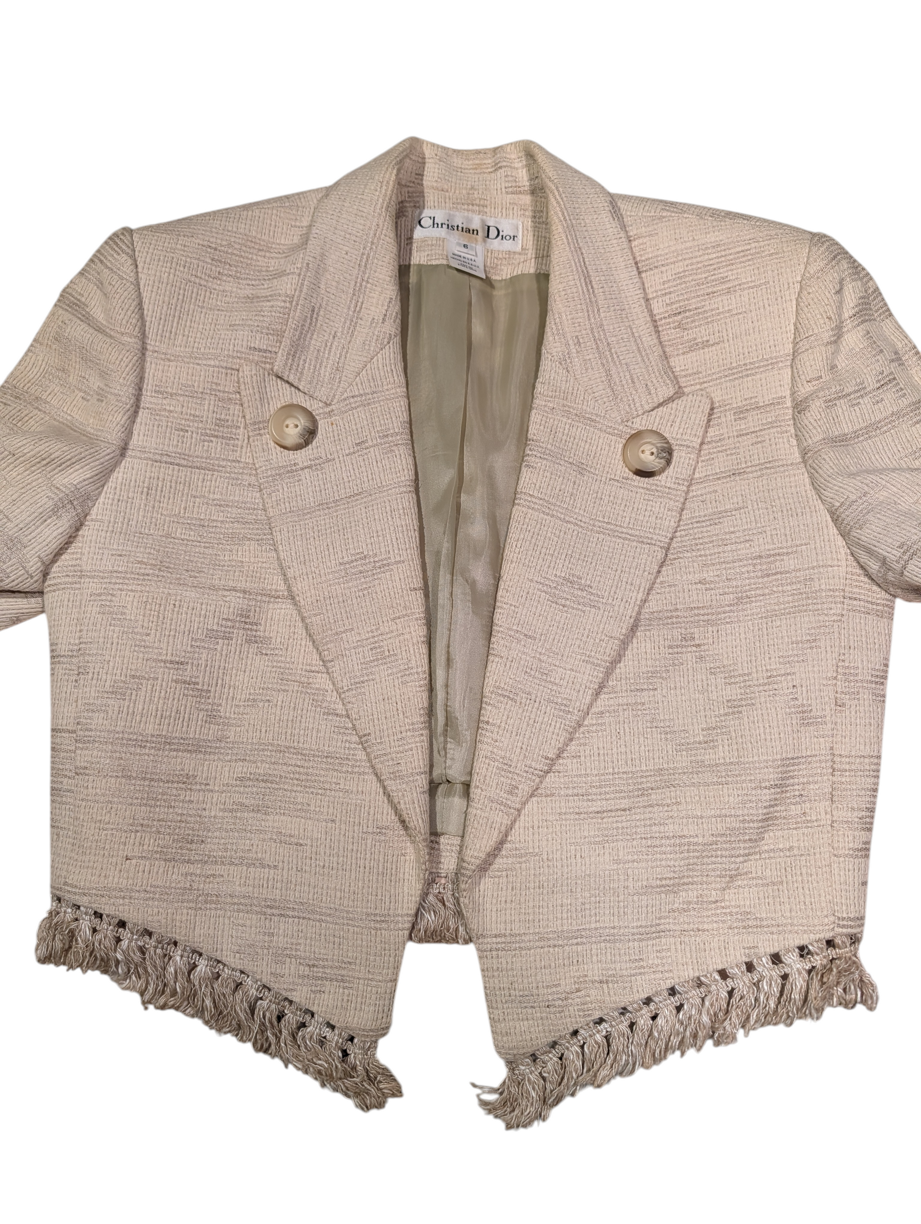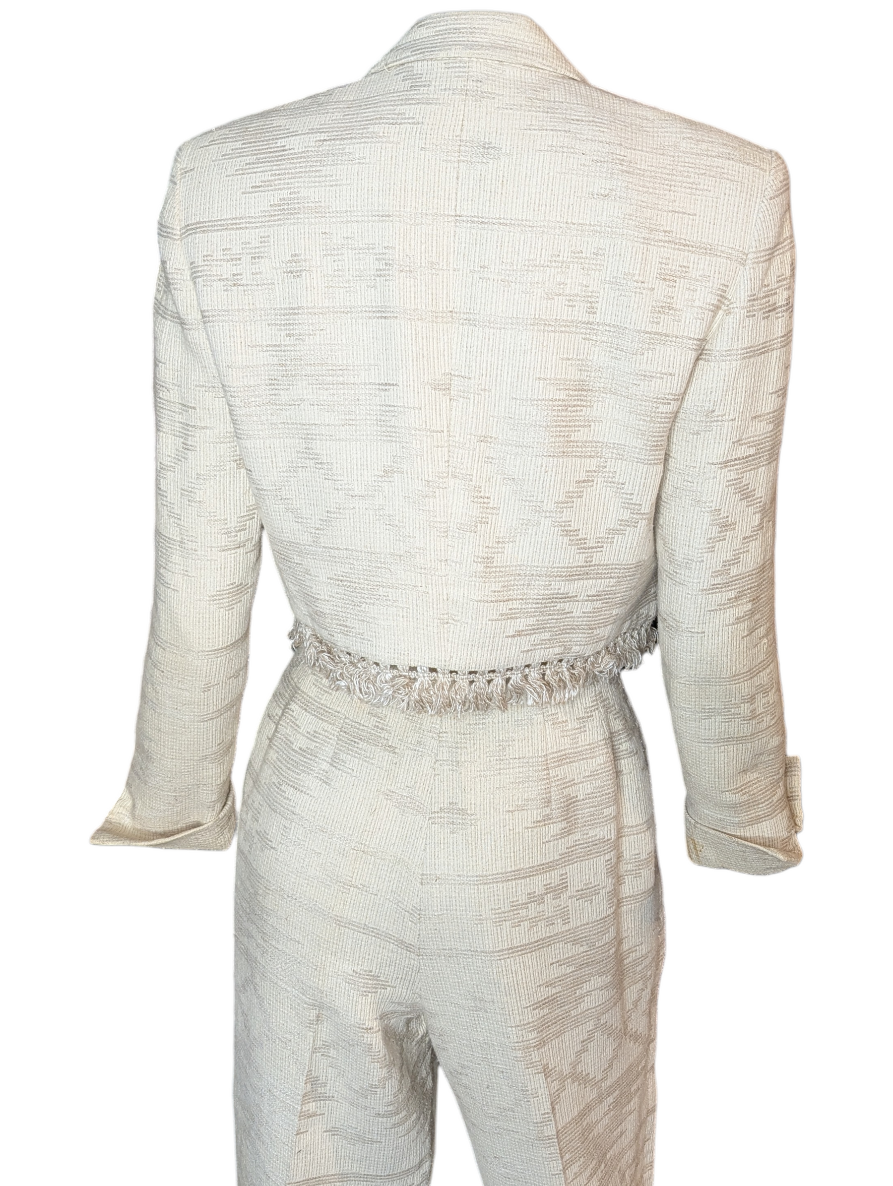 The ensemble features a sharply tailored cropped jacket, cut to sit high at the waist, with softly structured shoulders, sculpted lapels, and decorative fringe trim along the hem — a discreet but intentional embellishment characteristic of Dior’s late-Bohan era. The jacket is paired with high-waisted, pleated trousers, offering architectural balance through volume and line, a hallmark of late-1980s couture-influenced ready-to-wear.