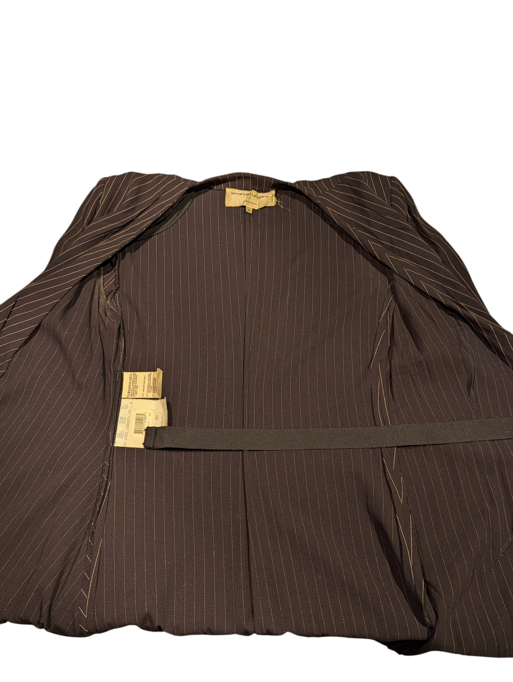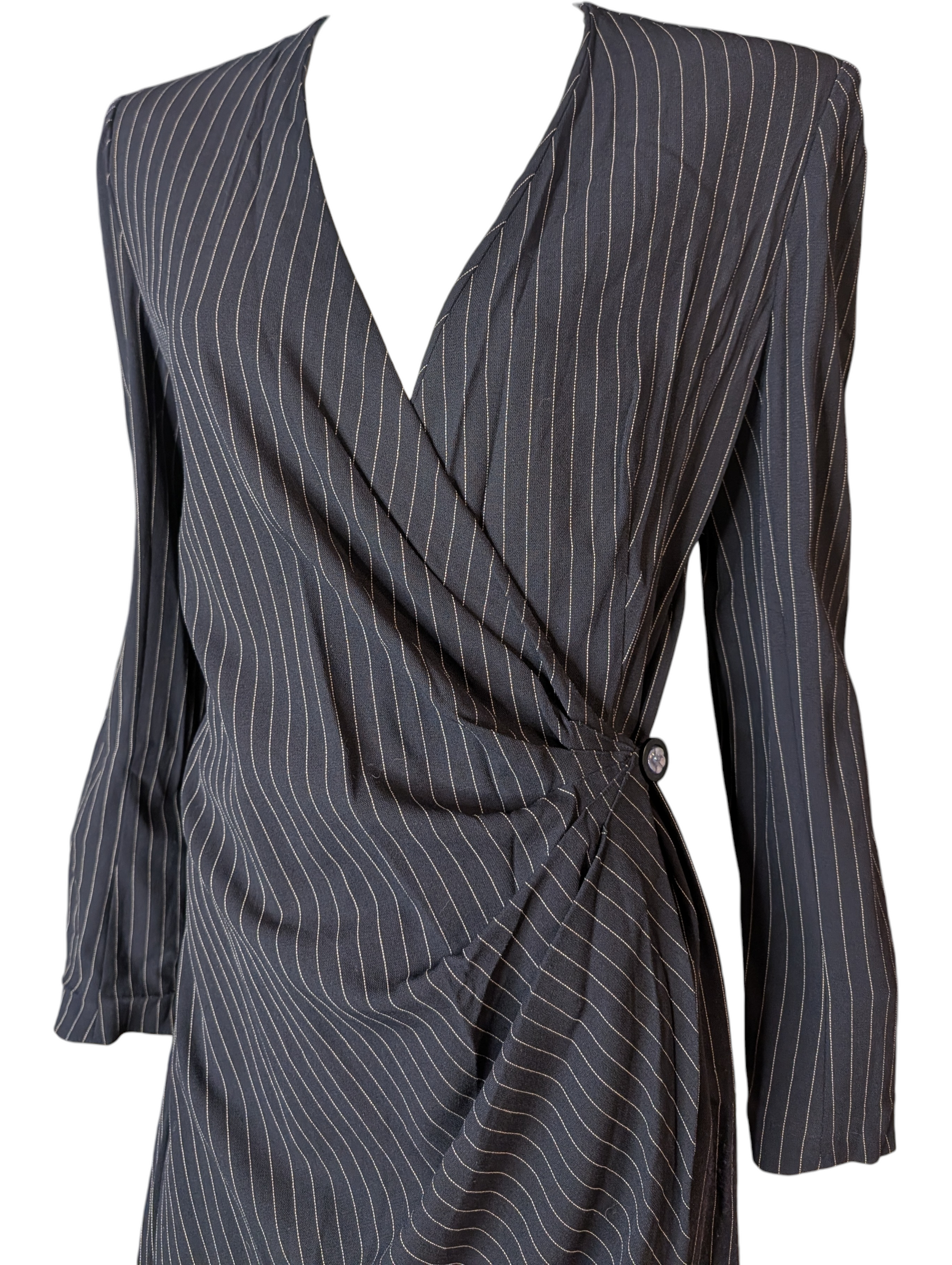 Sophisticated vintage wrap dress by Emanuel Ungaro Parallèle, crafted in a fine dark charcoal wool with subtle pinstripes. This elegant long-sleeve silhouette features a deep V neckline, sculptural wrap construction, and asymmetric draping secured with a side button closure. Tailored seams contour the waist and hips for a flattering, body-skimming fit, while the midi-length skirt falls with graceful movement. A refined example of Ungaro’s precise tailoring and timeless Parisian design, ideal for both elevated daywear and understated evening styling.