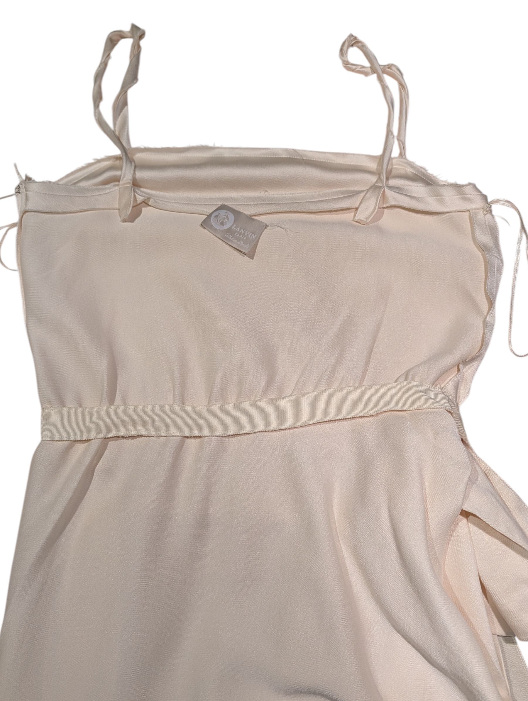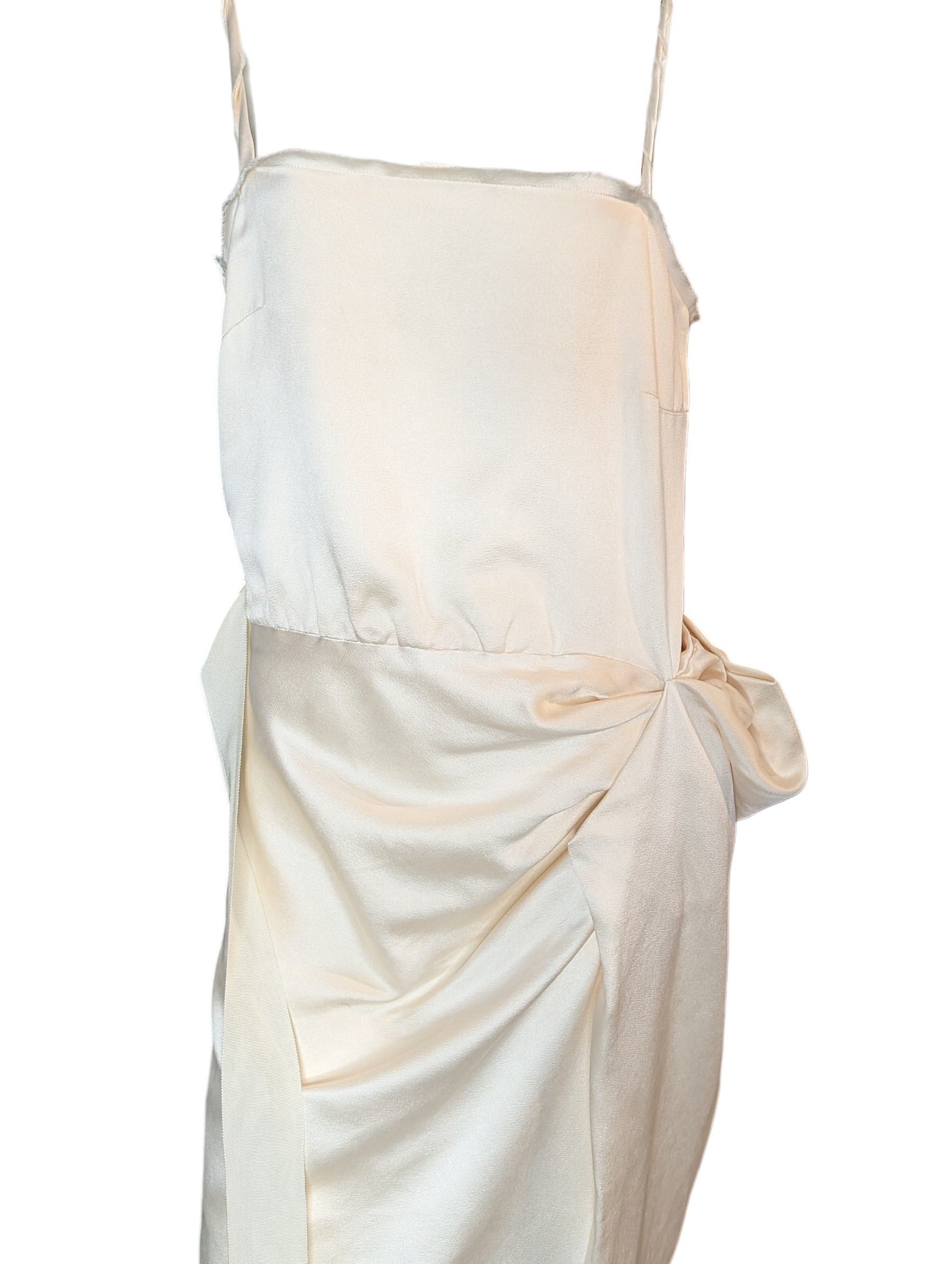 The bodice is delicately suspended by fine silk straps, leading into a softly contoured waist accented by an integrated sash detail. This sculptural knotting at the hip—subtle yet intentional—is characteristic of Elbaz’s approach during his early tenure at Lanvin, where femininity was expressed through restraint rather than embellishment.