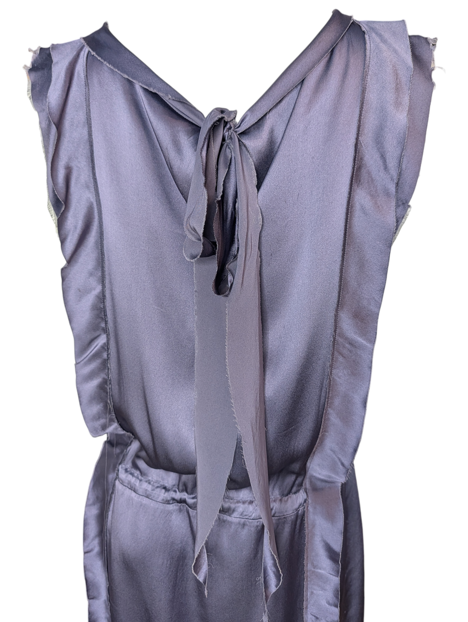 Vertical stitched panels through the bodice add gentle structure and visual elongation. At the back, the dress opens into a deep V neckline finished with long silk ties that create movement and a delicate bow detail.
