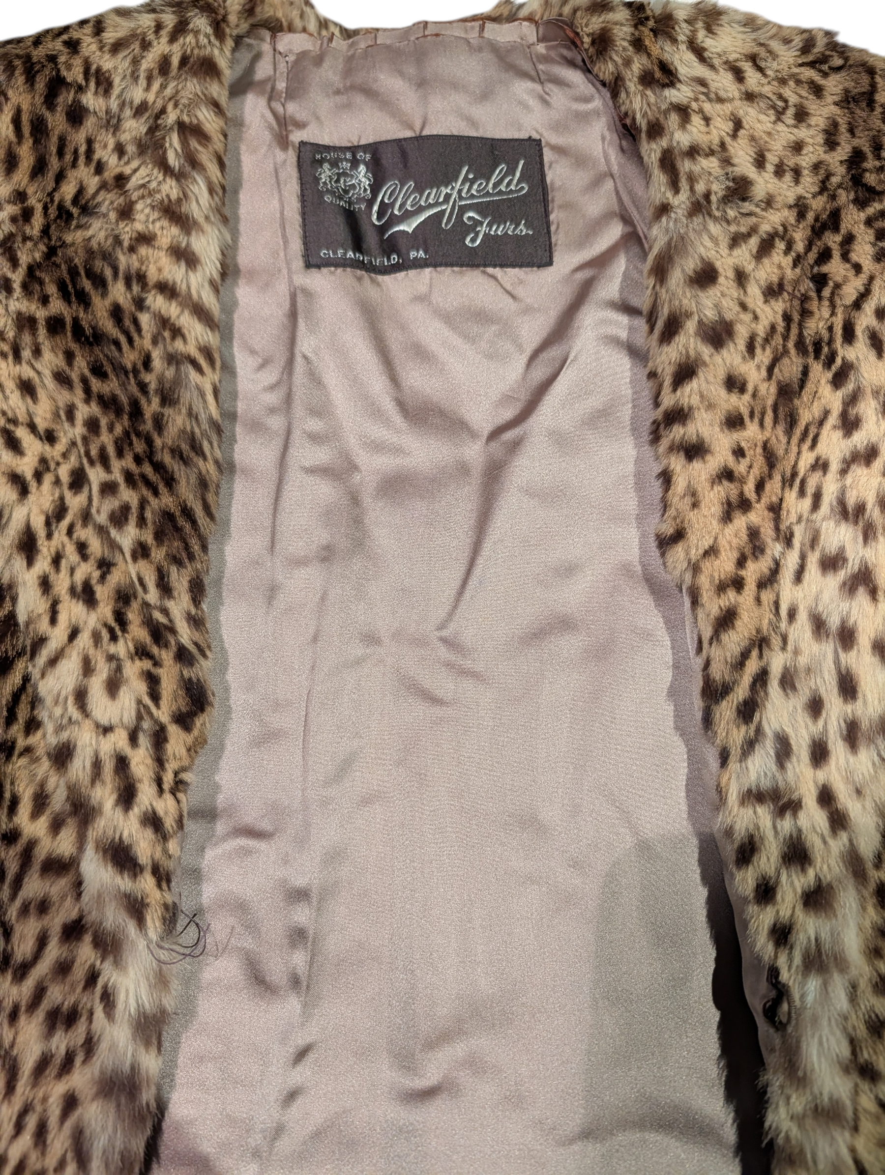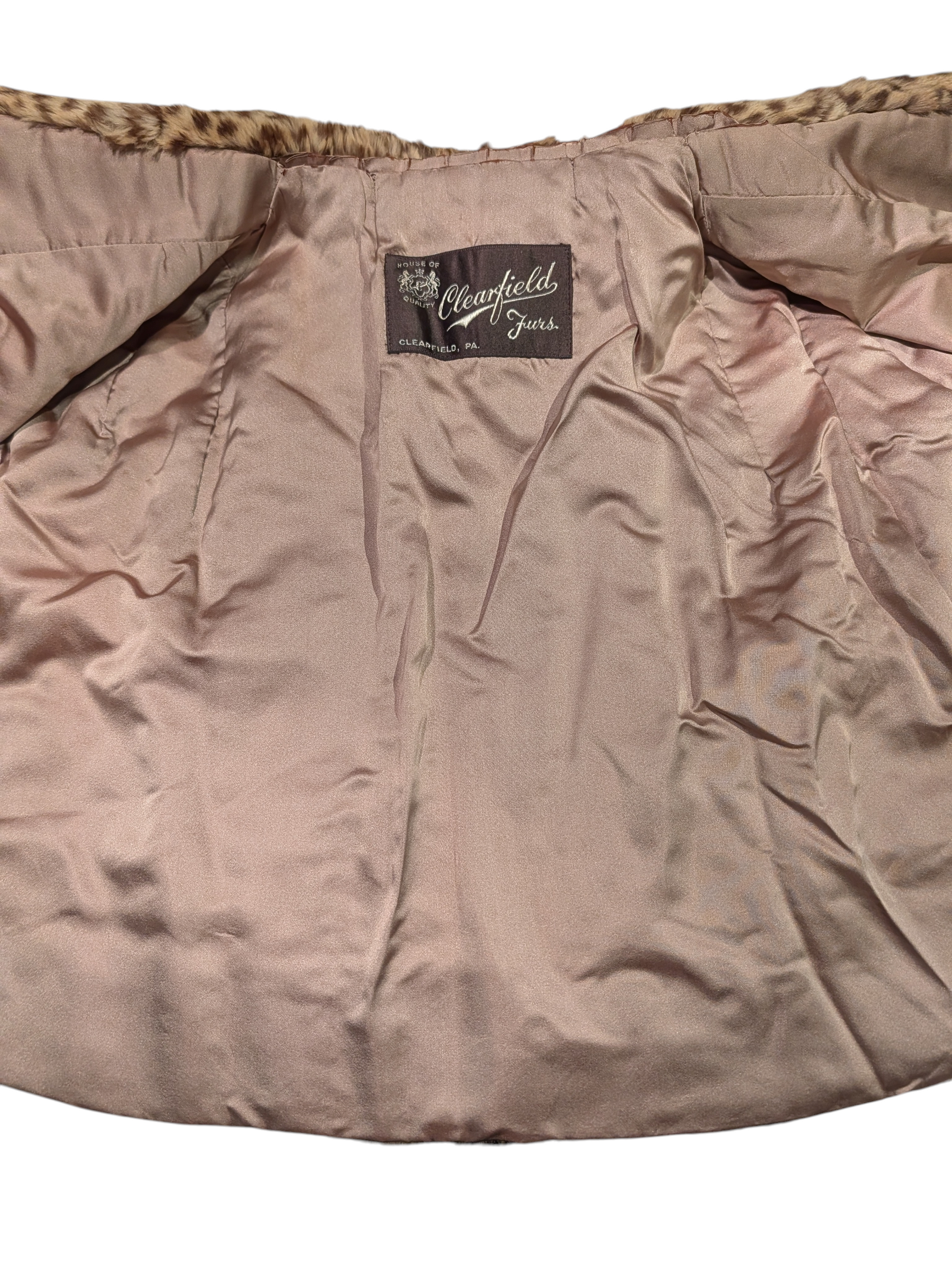 This exceptional 1960s ocelot fur stole is a rare and luxurious vintage piece, showcasing the striking natural spotted pattern that makes ocelot so iconic. Cut in a classic wrap silhouette, it drapes beautifully over the shoulders and adds instant glamour to eveningwear or formal outerwear. The stole features its original satin lining, lightly worn consistent with age, and is crafted by Clearfield Furs of Pennsylvania—an established mid-century furrier known for quality workmanship. A true collector’s piece, it embodies the elegance and drama of 1960s fashion.