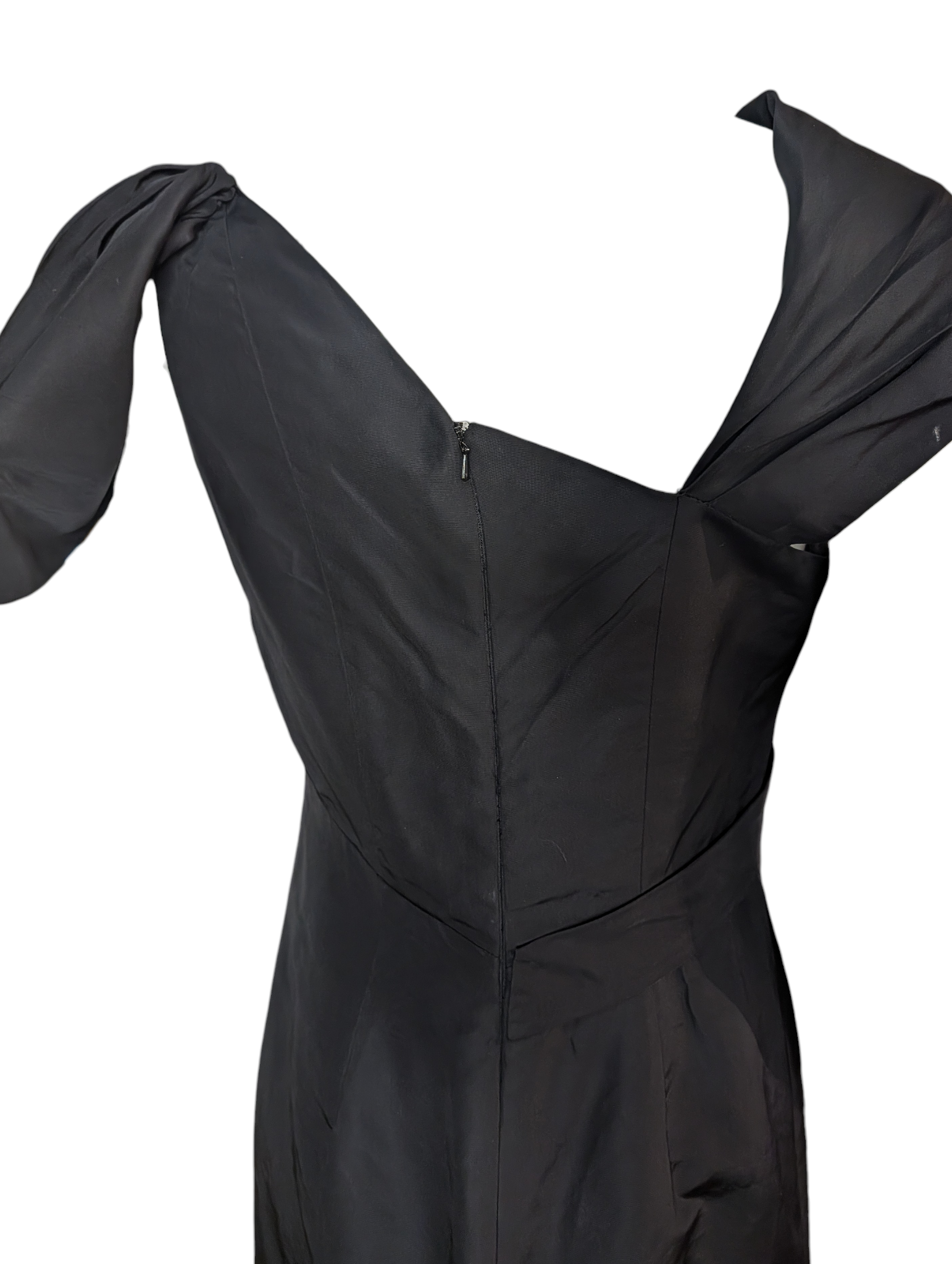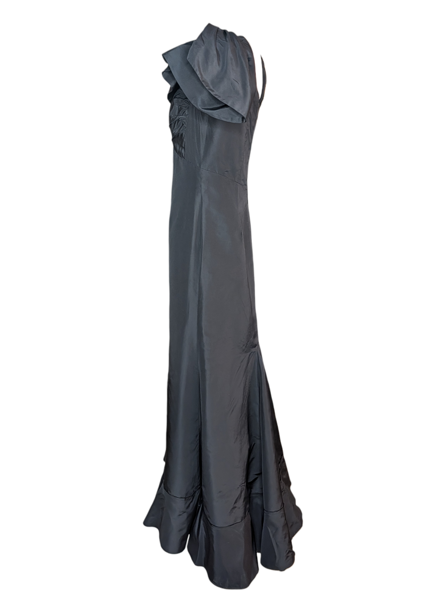 Oscar de la Renta black evening gown featuring a sculptural asymmetrical neckline and gathered bodice construction. Crafted in structured silk with architectural shoulder draping, the silhouette falls in a clean column before opening into a subtle flared hem.