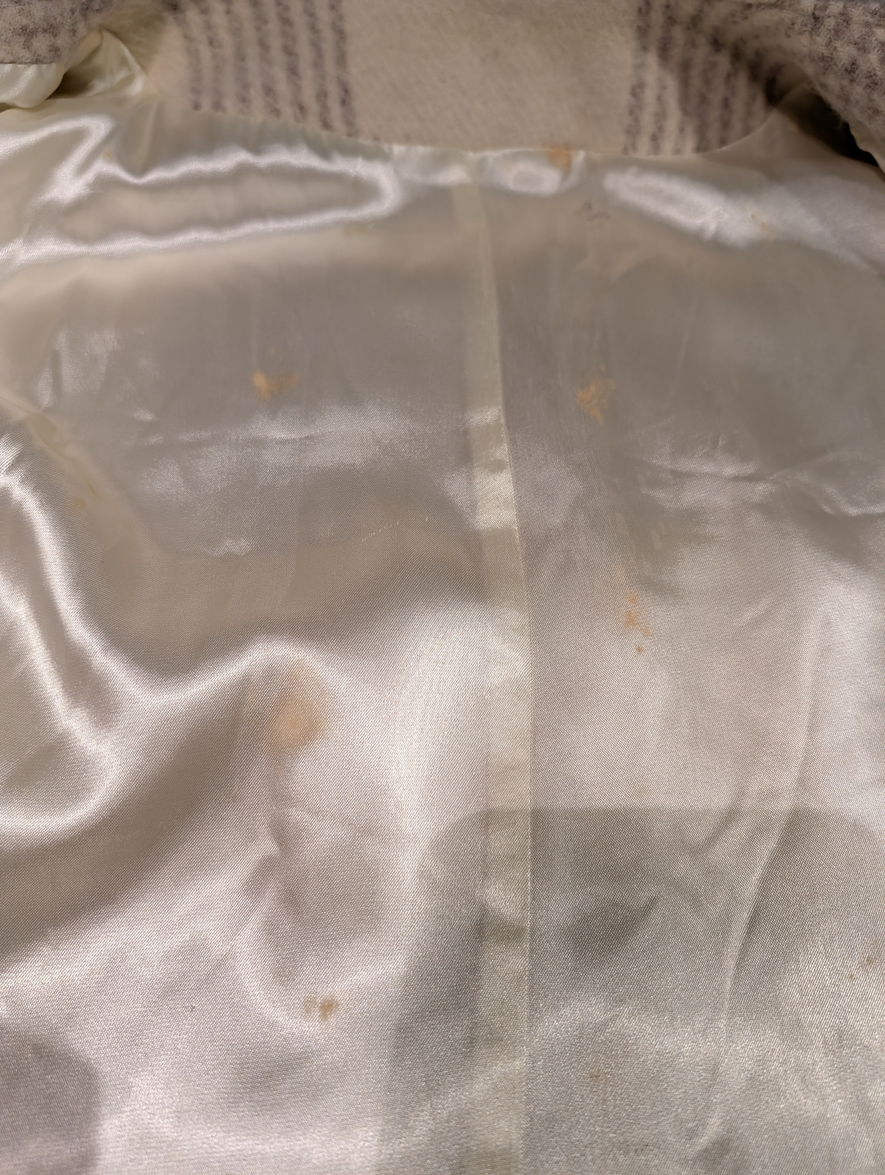 This piece includes wide sleeves, minimalist seaming, and a fully lined interior. The satin lining shows scattered discoloration consistent with age, but the exterior wool remains beautifully preserved. A striking statement coat for collectors of 1980s–1990s American designer fashion and lovers of sculptural outerwear.