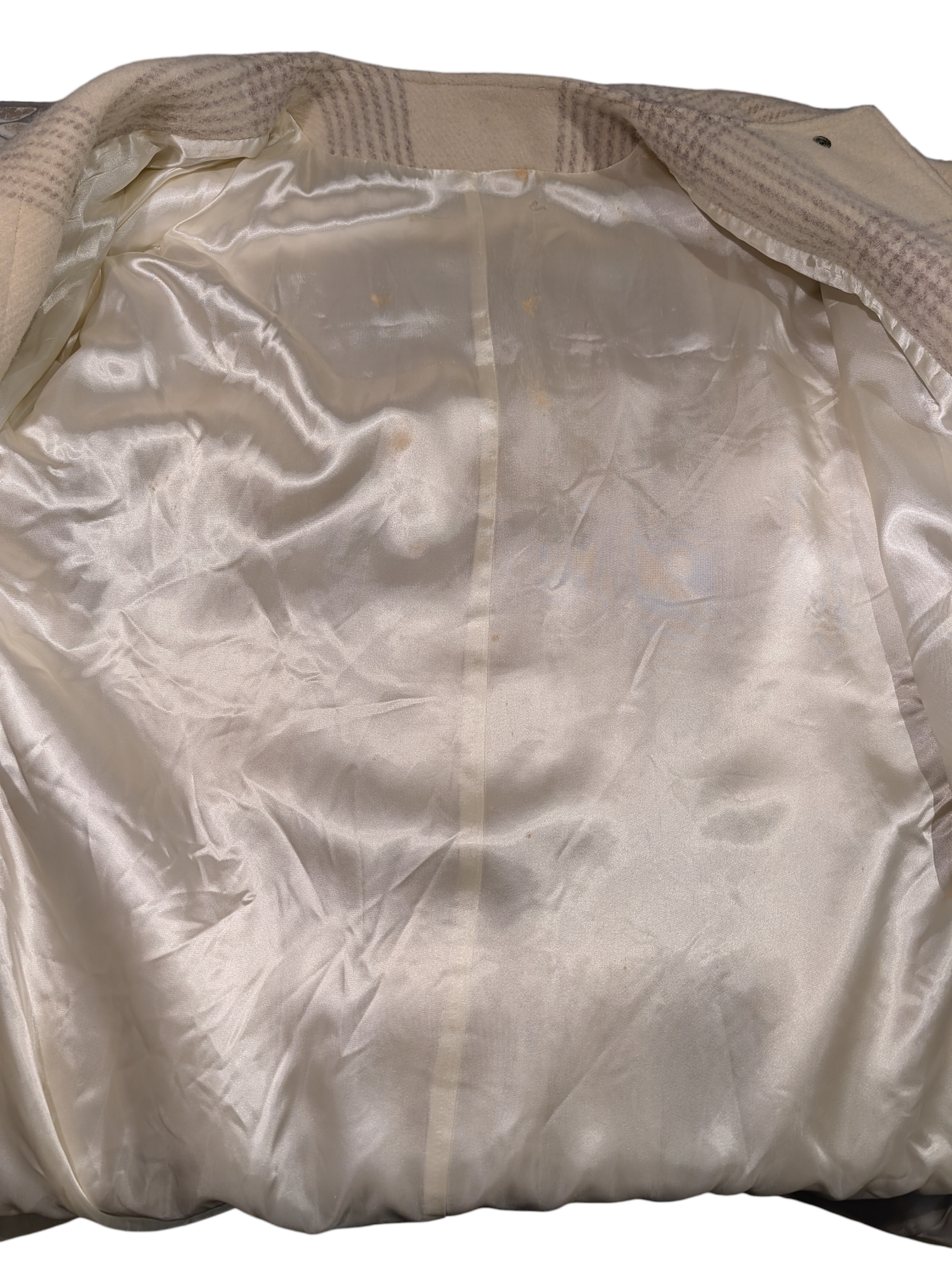 Elevated and architectural, this vintage Perry Ellis wool cape coat blends sculptural design with effortless wearability. Crafted in a soft ivory-and-taupe plaid wool, the coat features an asymmetric draped cape overlay that flows across the shoulder for a dramatic, modernist silhouette. An exposed top button closes the neckline, while the relaxed cut and mid-length hem create an elegant, easy drape over the body.
