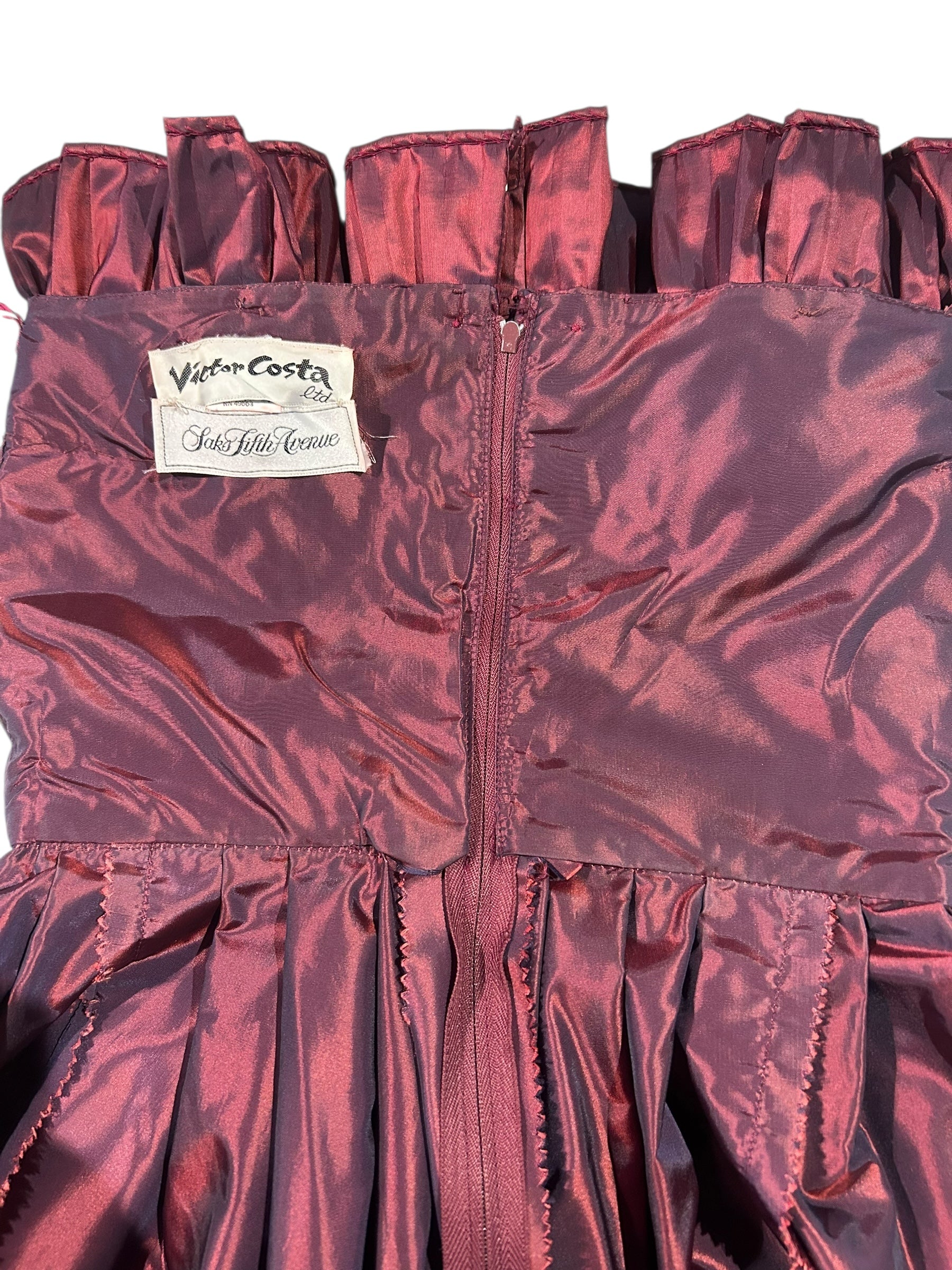 A theatrical and romantic creation by Victor Costa, this iridescent purple evening gown captures the designer’s flair for sculptural glamour and fantasy couture. Crafted from lustrous nylon taffeta that shifts between violet and wine tones under light, the gown exudes drama and elegance in equal measure.