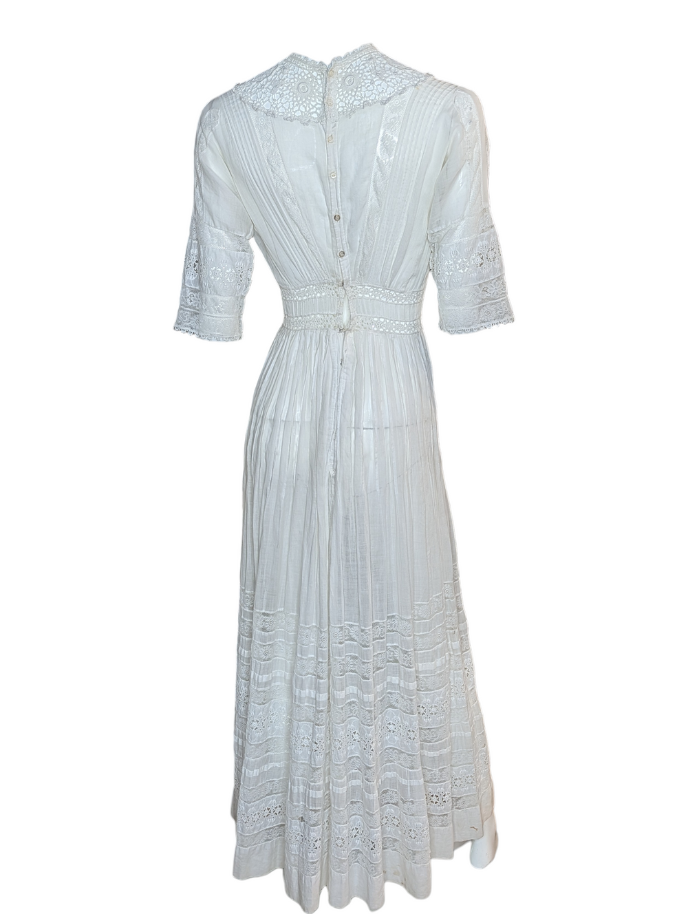Edwardian White Cotton Eyelet Lace Wedding Gown with High Neck and Pintuck Detailing