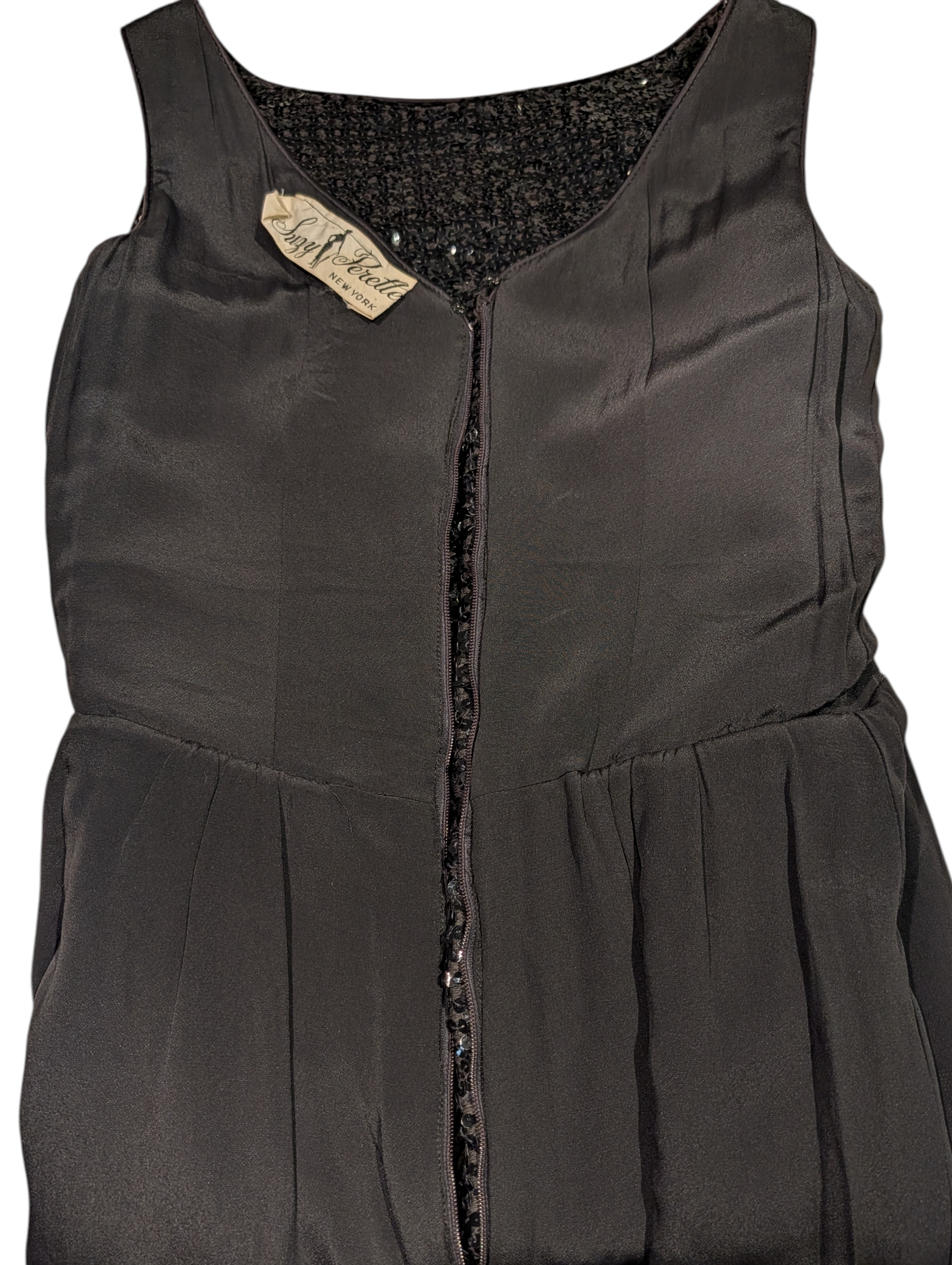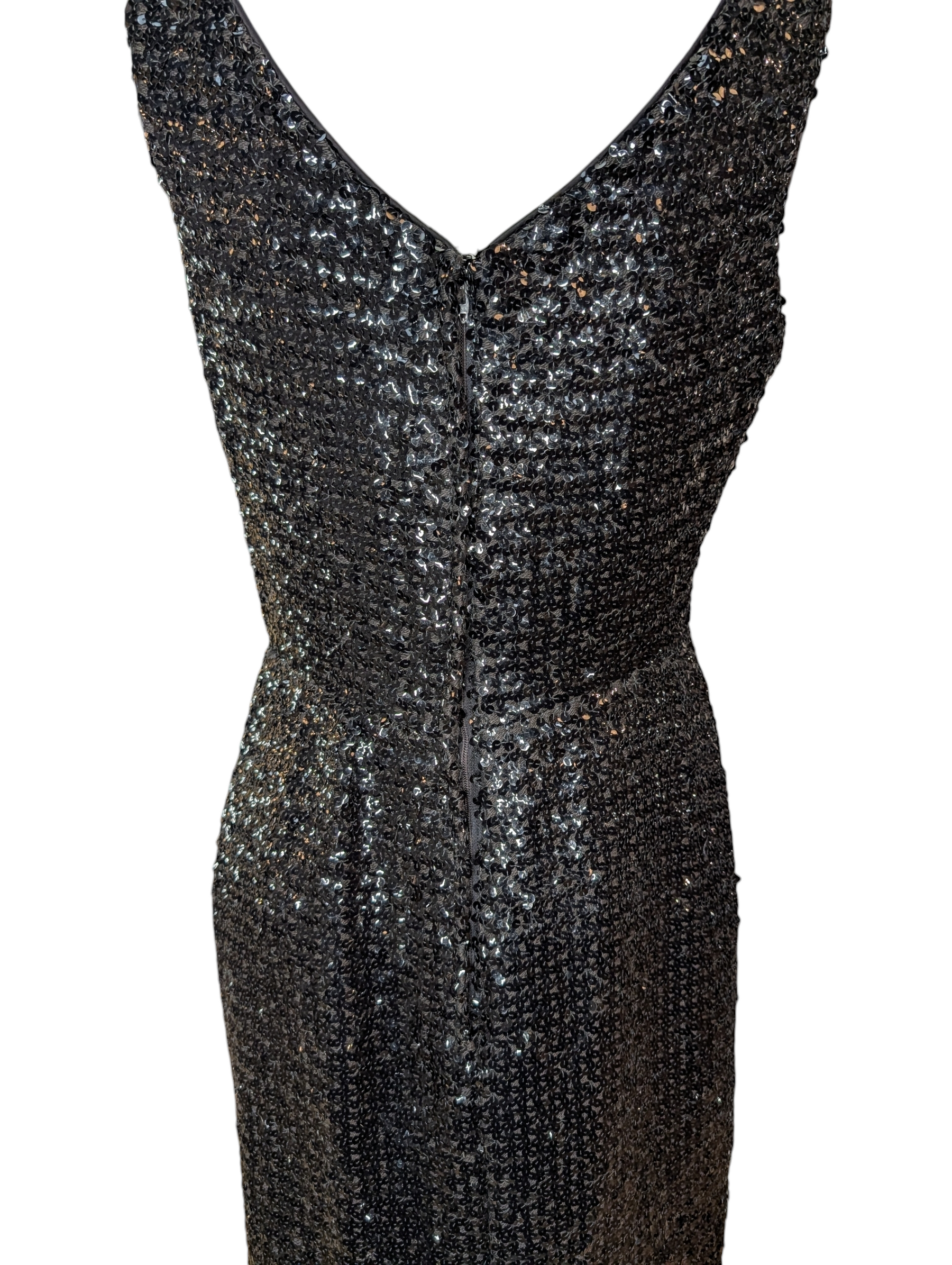 A rare and glamorous 1950s Suzy Perette cocktail dress, fully hand-sequined over a black knit base for a dazzling, liquid-shine effect. This mid-century stunner features a classic sheath silhouette, a flattering V-back, and an elegant wide neckline that frames the shoulders beautifully. The knit construction allows slight stretch while maintaining a sculpted fit, and the dress is fully backed for comfort and structure. A true vintage collectible from a label celebrated for its couture-inspired constructions and impeccable eveningwear. Perfect for holiday parties, cocktail events, or collectors of mid-century fashion.
