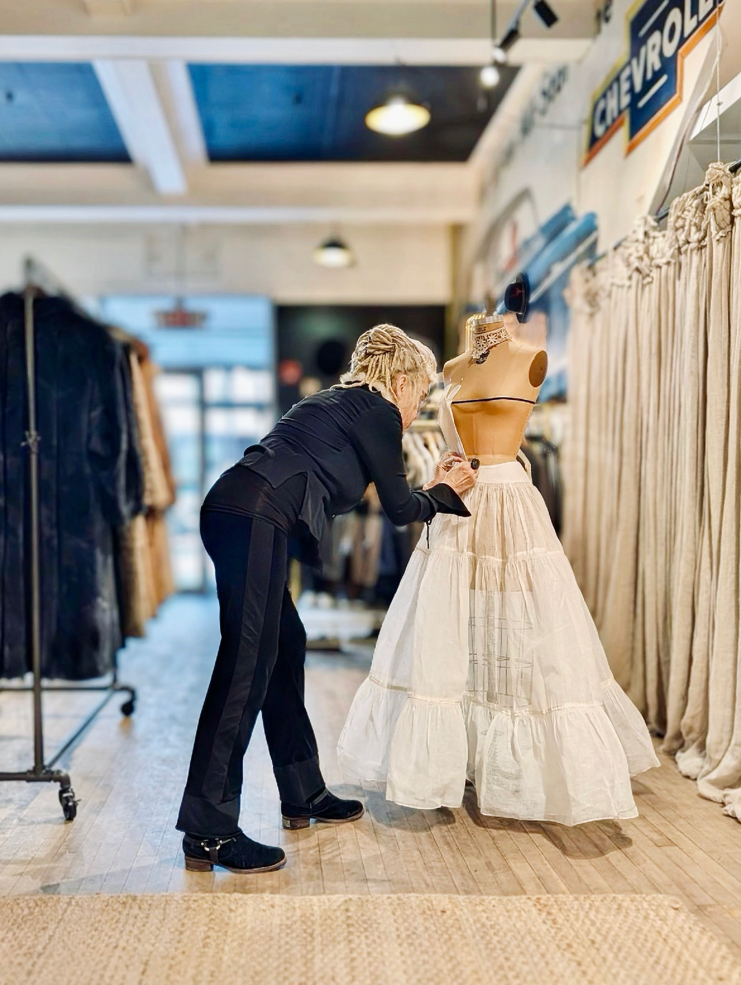 Colleen is also a designer, capable of transforming something ordinary into something extraordinary — refining silhouette, volume, and structure until the garment becomes intentional and architectural.