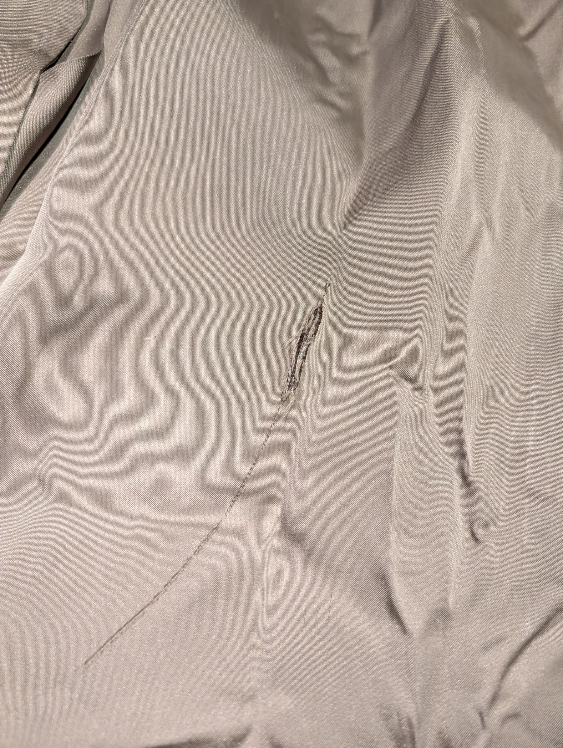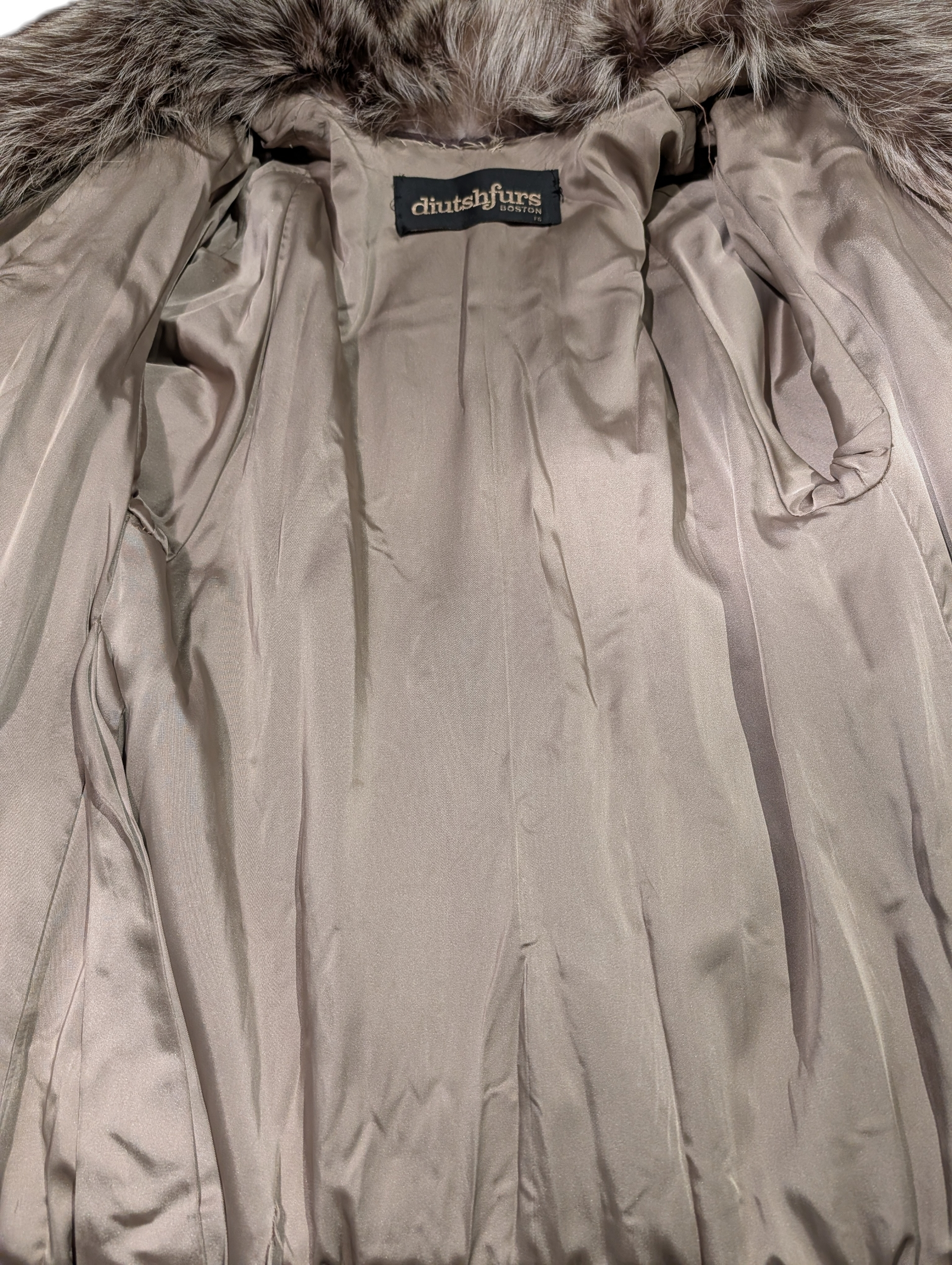 Designed with practical elegance, the coat features hidden hook-and-eye closures along the front and two plush-lined pockets seamlessly integrated into the side panels. Fully lined for comfort, with one small interior tear noted — otherwise excellent condition with full, healthy pelts.